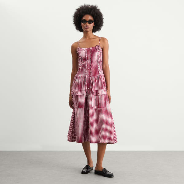 Платье миди Damson Madder Faith сочетает в себе классический шарм и универсальность. Платье выполнено из органического хлопка в клетку гингем, застегивается на пуговицы спереди и имеет регулируемые бретели для идеальной посадки. Разработанное в Лондоне, это элегантное платье легко адаптируется как к летним прогулкам, так и к многослойным осенним образам. Это практичная базовая модель с продуманными деталями, такими как оборки и пуговицы в форме сердца, которые подчеркивают фирменный стиль бренда.