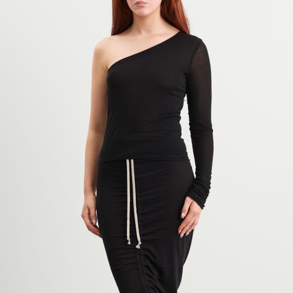 Этот полупрозрачный топ от его одноименного бренда, воплощающий воздушную и скульптурную эстетику Рика Оуэнса, воспевает красоту тела во всей его первозданной красоте. Футболка Ziggy из струящейся вискозной смеси мягко облегает силуэт, подчёркивая ключицы, создавая минималистичную элегантность, одновременно чувственную и сдержанную.
