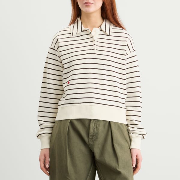 JW Anderson переосмысливает классическое поло, предлагая игривый укороченный силуэт в этой полосатой трикотажной толстовке-поло. Спущенные плечи и пуговицы в тон, она украшена контрастной вышивкой спереди и ярким логотипом сзади. Ребристые манжеты и подол завершают образ — спортивный, классический и безошибочно узнаваемый образ JW Anderson.
