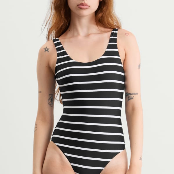 Полосатый купальник Anine Bing Jace – это классический стиль с современным и экологичным подходом. Изготовленный из смеси переработанного нейлона и спандекса, он имеет облегающую посадку, классический круглый вырез горловины и глубокий вырез на спине, подчеркивающий фигуру. Полностью на подкладке и с отделкой в элегантные черно-белые полоски – ваш идеальный выбор для солнечных дней.