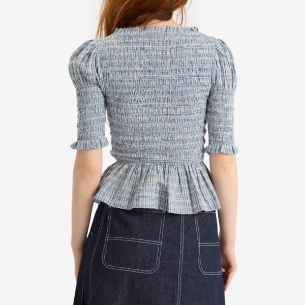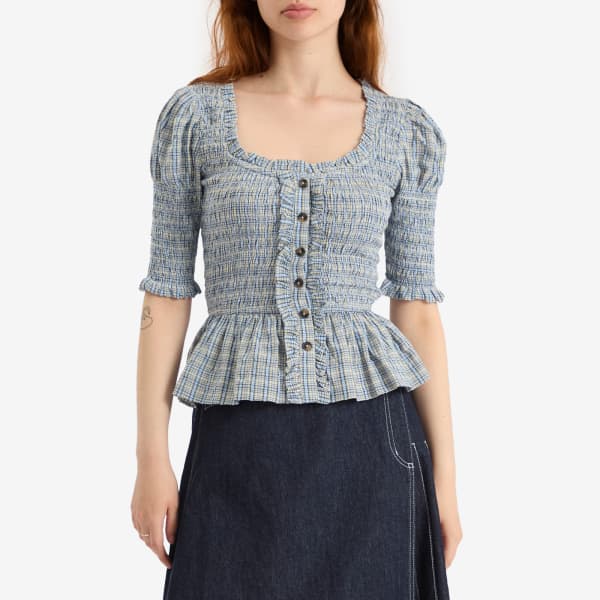 Блузка Mansi от Damson Madder с присборенным лифом сочетает в себе вневременной стиль и экологичное мастерство. Изготовленная из органического хлопка в фирменную клетку бренда, она отличается объемными плечами, присборенным лифом и игривым подолом с баской, что обеспечивает привлекательный, структурированный крой и комфорт. Блузка дополнена изящными деталями, такими как присборенные рукава и застежка на пуговицы спереди.
