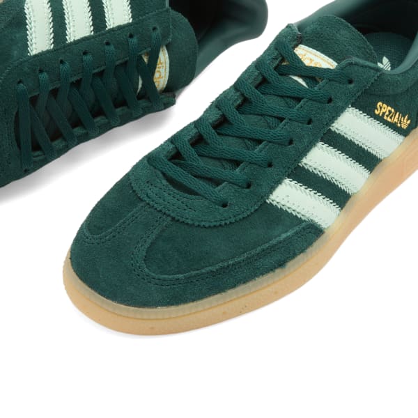Неподвластный времени характер и толстая резиновая подошва кроссовок Adidas Handball Spezial сделали их культовыми. Впервые выпущенные в 1979 году как функциональные спортивные кроссовки, плоская подошва Handball Spezial обеспечивает отличное сцепление на гандбольных площадках. Сегодня архивные кроссовки Adidas естественным образом вошли в современный гардероб благодаря своей плоской подошве и зазубренным трем полоскам. Эта версия отличается верхом из премиальной замши с кожаными деталями, что делает кроссовки ещё более стильными.