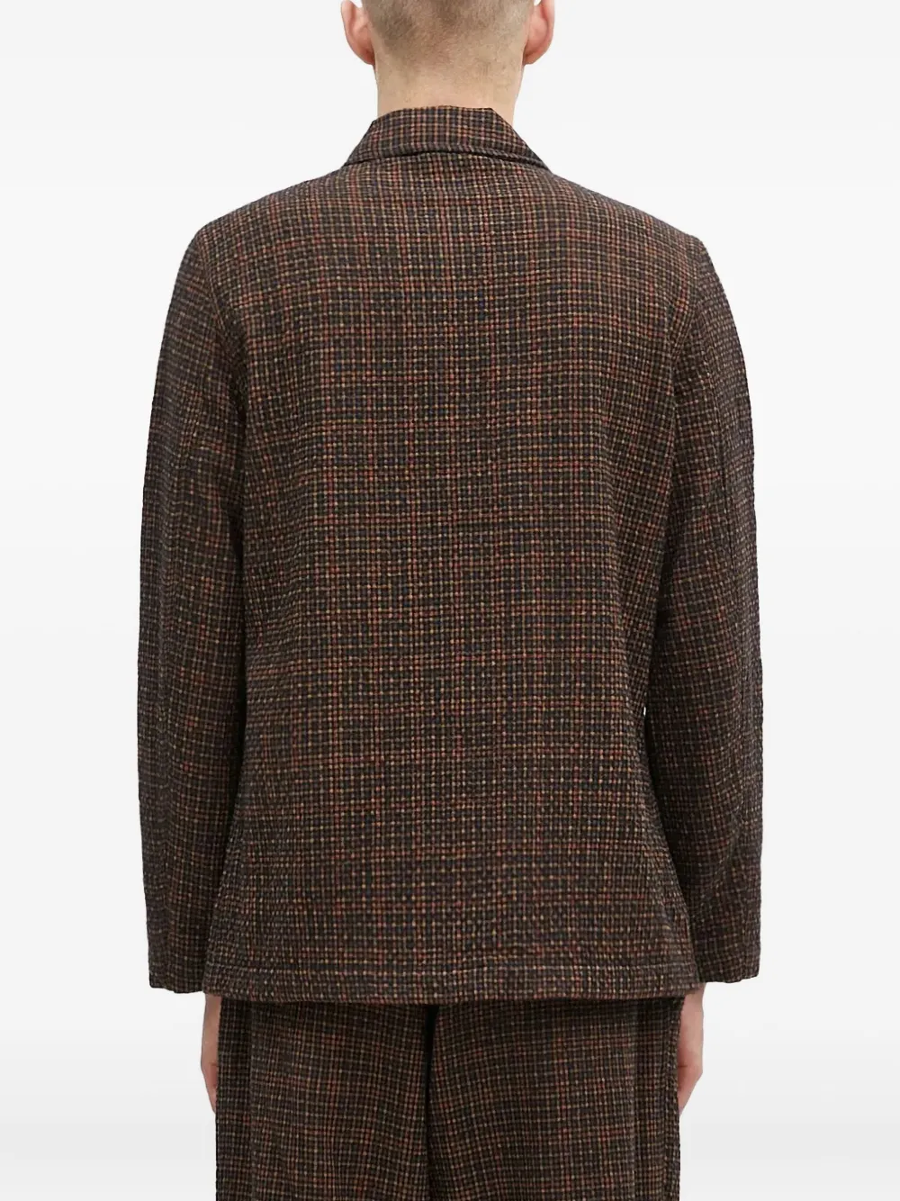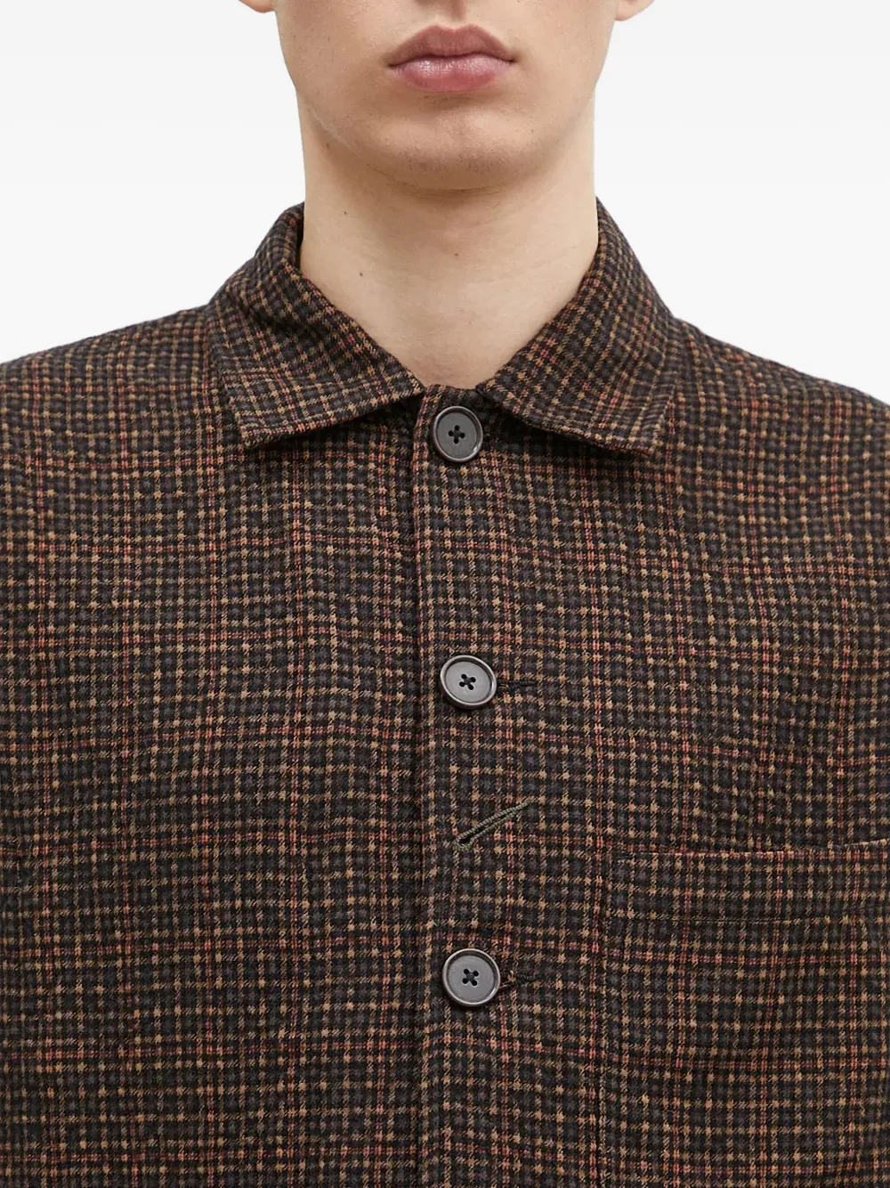 Коричневый клетчатый узор, застежка на пуговицы, накладные карманы, воротник, длинные рукава