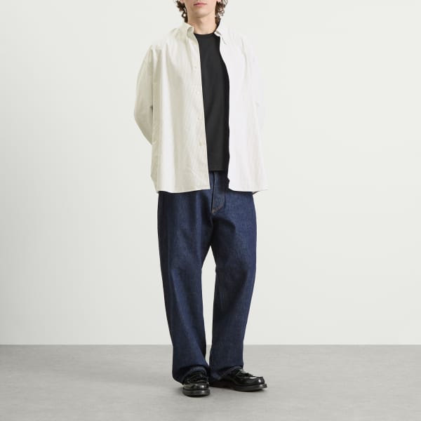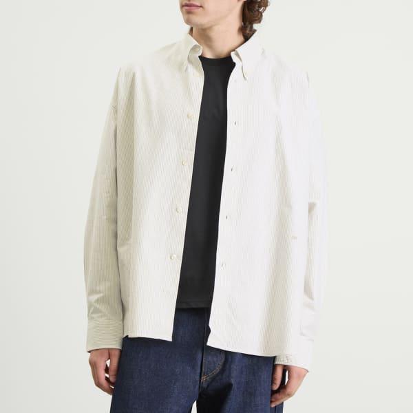 Studio Nicholson делает ставку на спокойную палитру нейтральных и приглушенных тонов, создавая изысканную и гармоничную эстетику. В этом сезоне британский бренд переосмысливает классическую оксфордскую рубашку свободного силуэта, украшенную тонкими полосками и монограммой SN в тон, создающей сдержанный фирменный стиль.