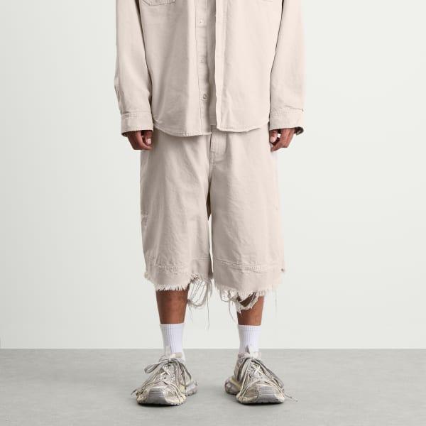 Balenciaga, вдохновлённый суровой эстетикой рабочей одежды, придаёт этим шортам-карго деконструированный вид. Они выполнены из плотного хлопка и имеют современный свободный крой, идеально сочетающийся с чем угодно: от облегающей футболки до столь же свободного топа. Необработанные края и потёртости дополняют образ, придавая ему бунтарский, но поношенный вид.