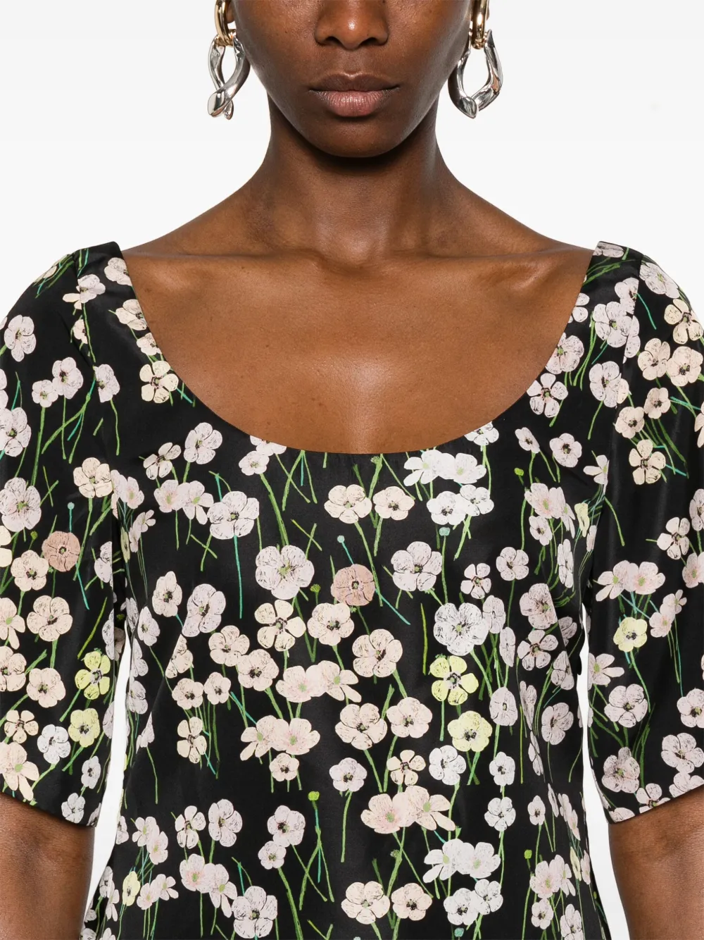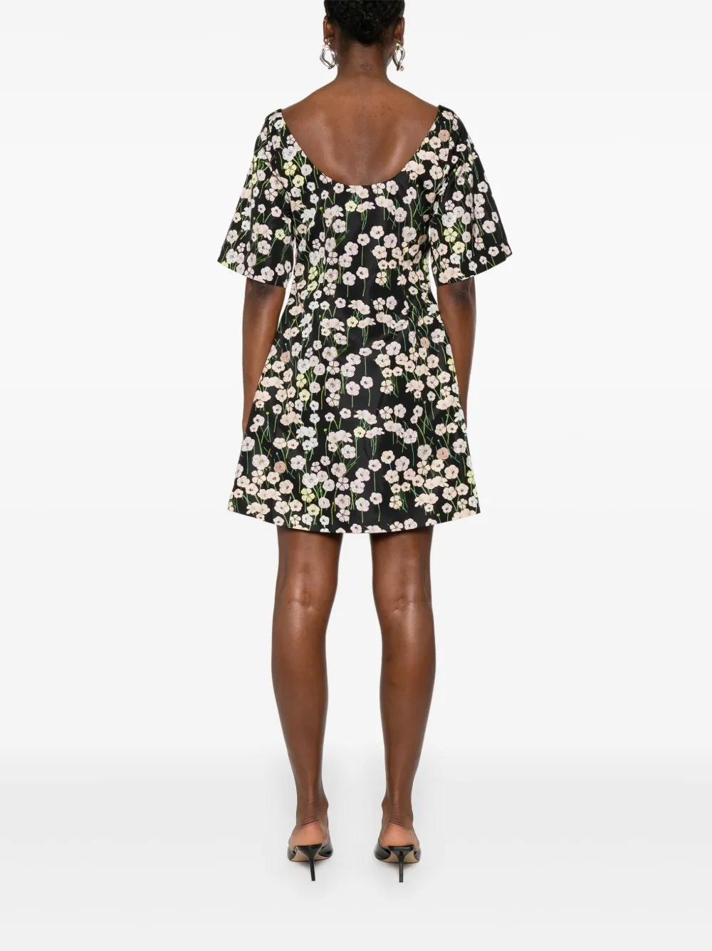 Черная потайная молния сбоку, два боковых кармана, цветочный принт по всей поверхности, округлый вырез горловины