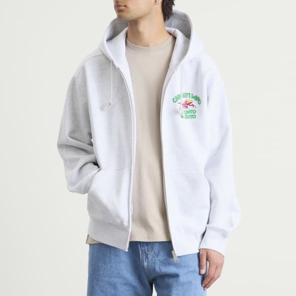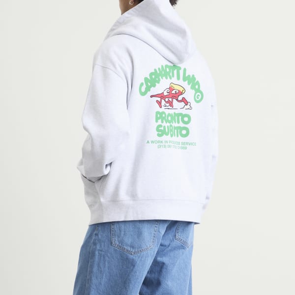 Ощутите драйв с новой коллекцией Pronto Subito от Carhartt WIP. Эта толстовка сшита из плотного поликоттонового трикотажа с начесом, мягкой флисовой подкладкой и свободным кроем с приспущенными плечами. Главная фишка? Изображение кусочков пиццы, бегущих по бокам.