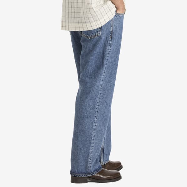 Джинсы Steve Denim от Won Hundred сочетают в себе винтажный стиль и современный дизайн. Свободный крой в стиле 90-х, средняя посадка и свободный прямой крой создают простой и практичный образ. Выполненные в синей расцветке с лёгким выцветанием, джинсы отличаются классической пятикарманной конструкцией, фурнитурой с логотипом и фирменными вытачками на задних карманах, что придаёт им изысканный вид.
