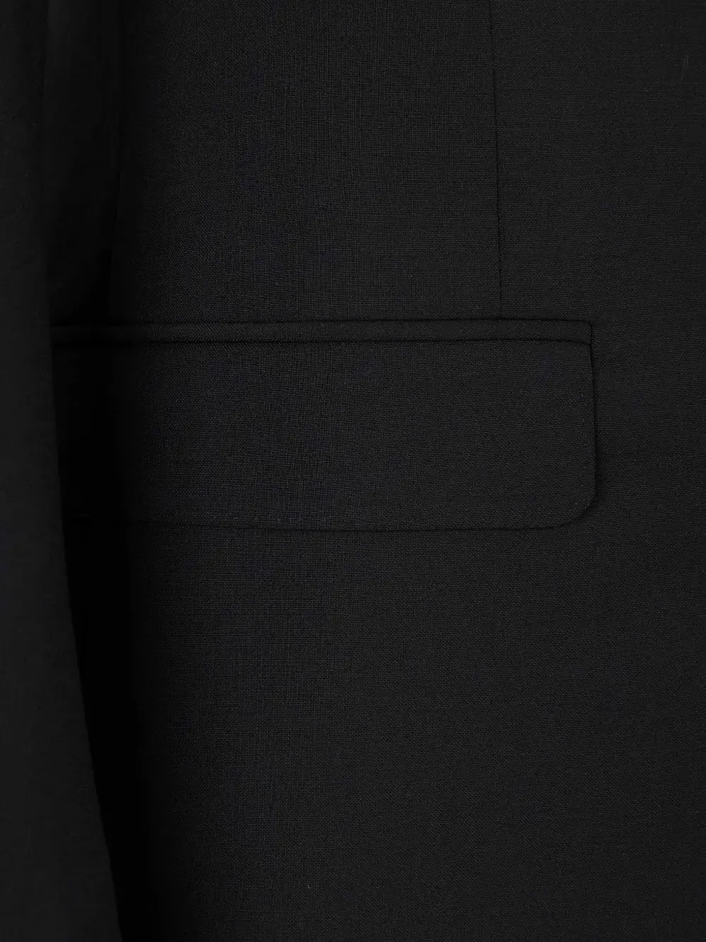 Черная шерсть, застежка на пуговицы спереди, карманы с клапанами, передние карманы, шлевки для ремня