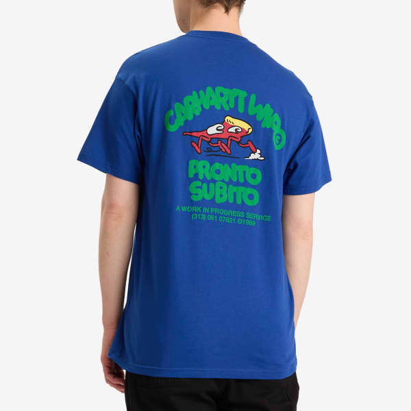 Футболка Carhartt WIP с ярким принтом выполнена из лёгкого хлопкового трикотажа, обеспечивающего комфорт в течение всего дня. Свободный крой и принт Pronto Subito вдохновлены ресторанами, где можно заказать пиццу на вынос.