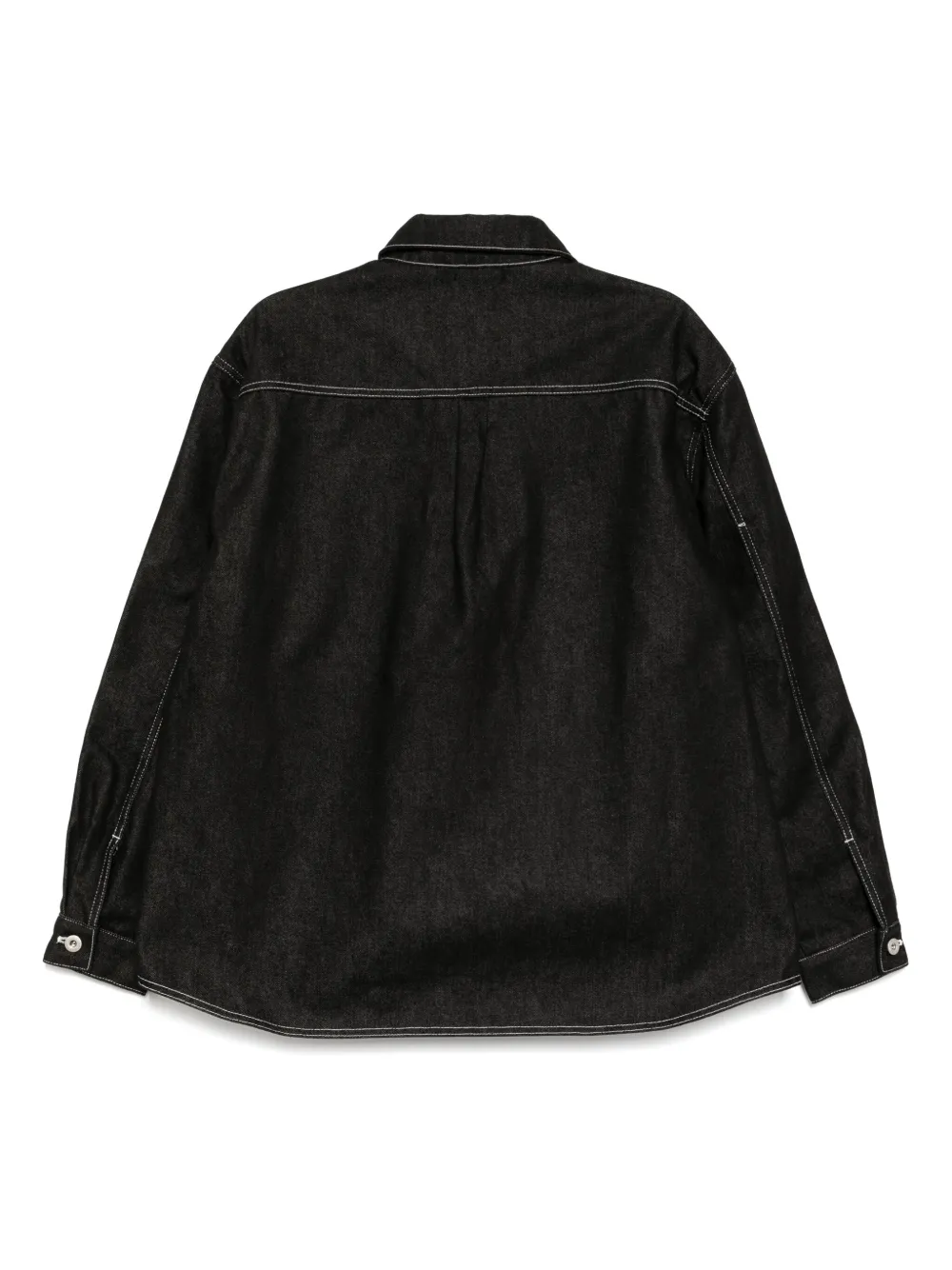 Черная застежка на пуговицы спереди, декоративный элемент в виде брызг краски, классический воротник, контрастная строчка