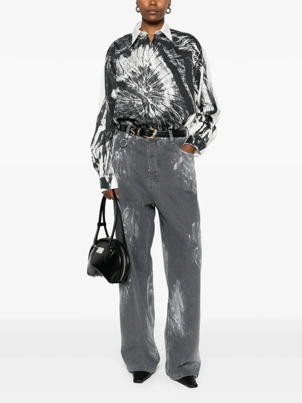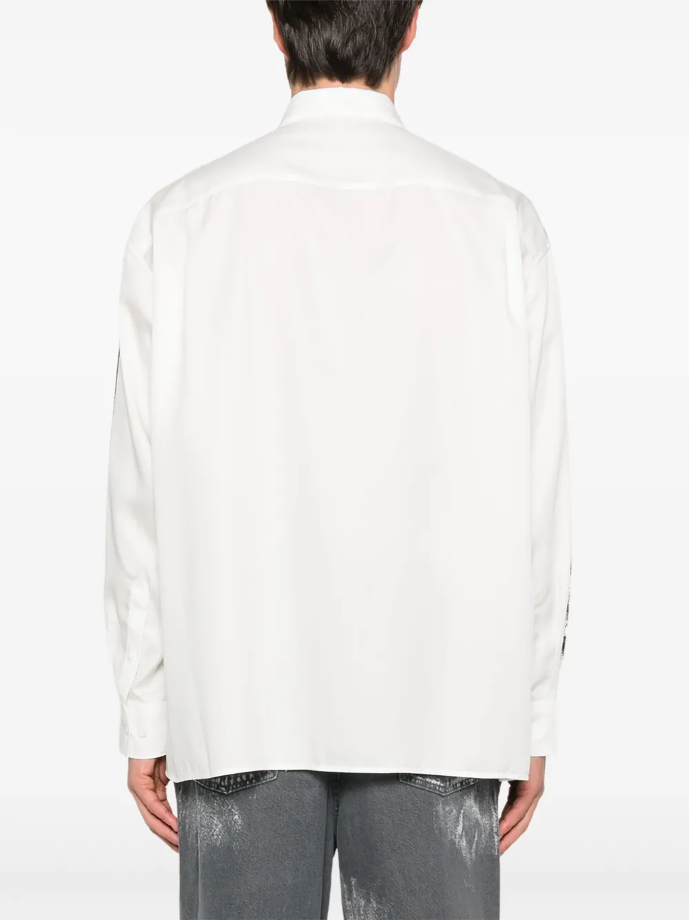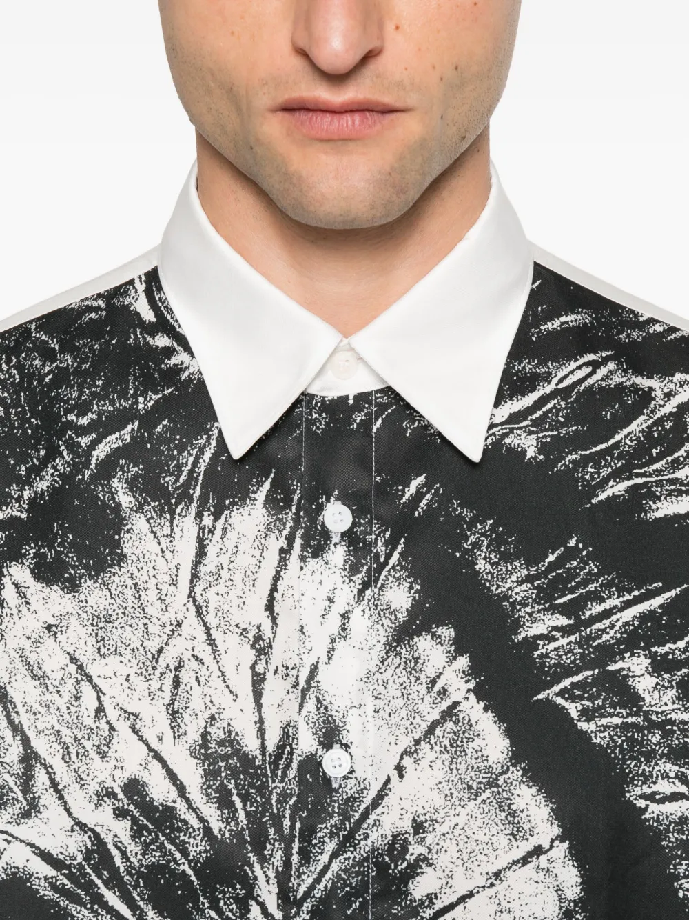 Белый с черным принтом, длинные рукава, застежка на пуговицы, воротник-стойка, принт по всей поверхности