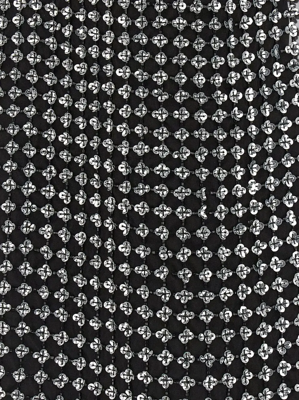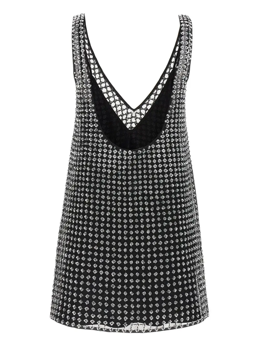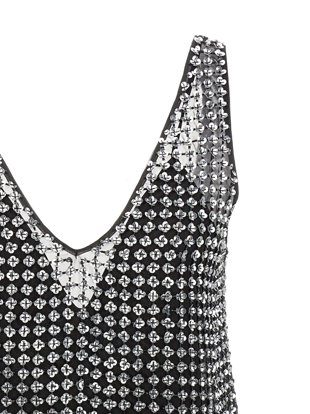 Черный, глубокий V-образный вырез, без рукавов, отделка пайетками по всей поверхности, свободный силуэт, открытая спина, легкий мерцающий эффект