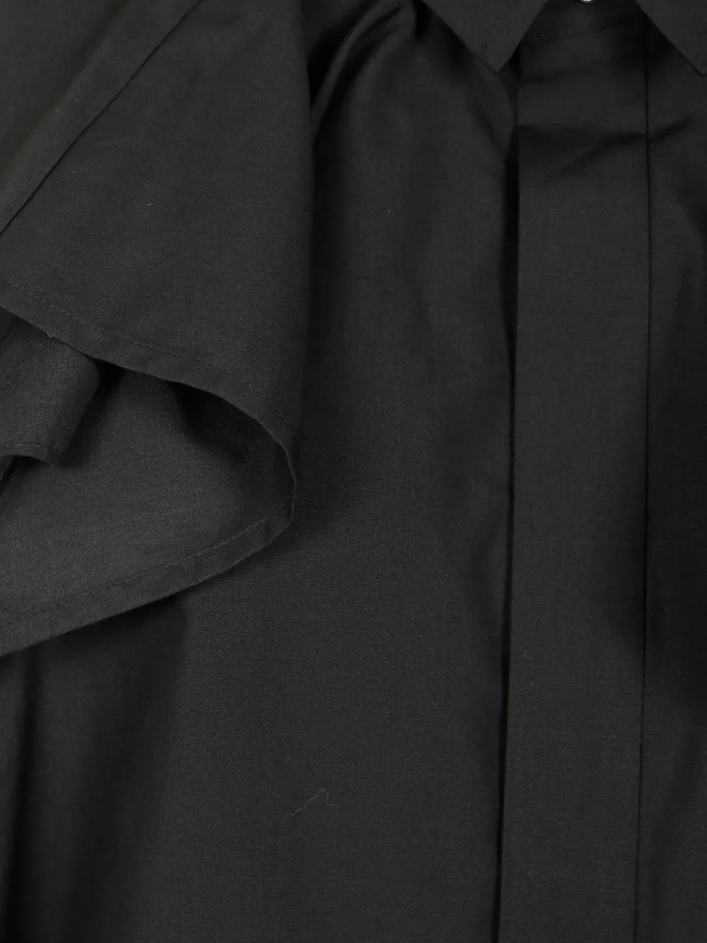 Черная застежка на пуговицы спереди, оборка на плечах, классический воротник, складки сзади, боковые карманы