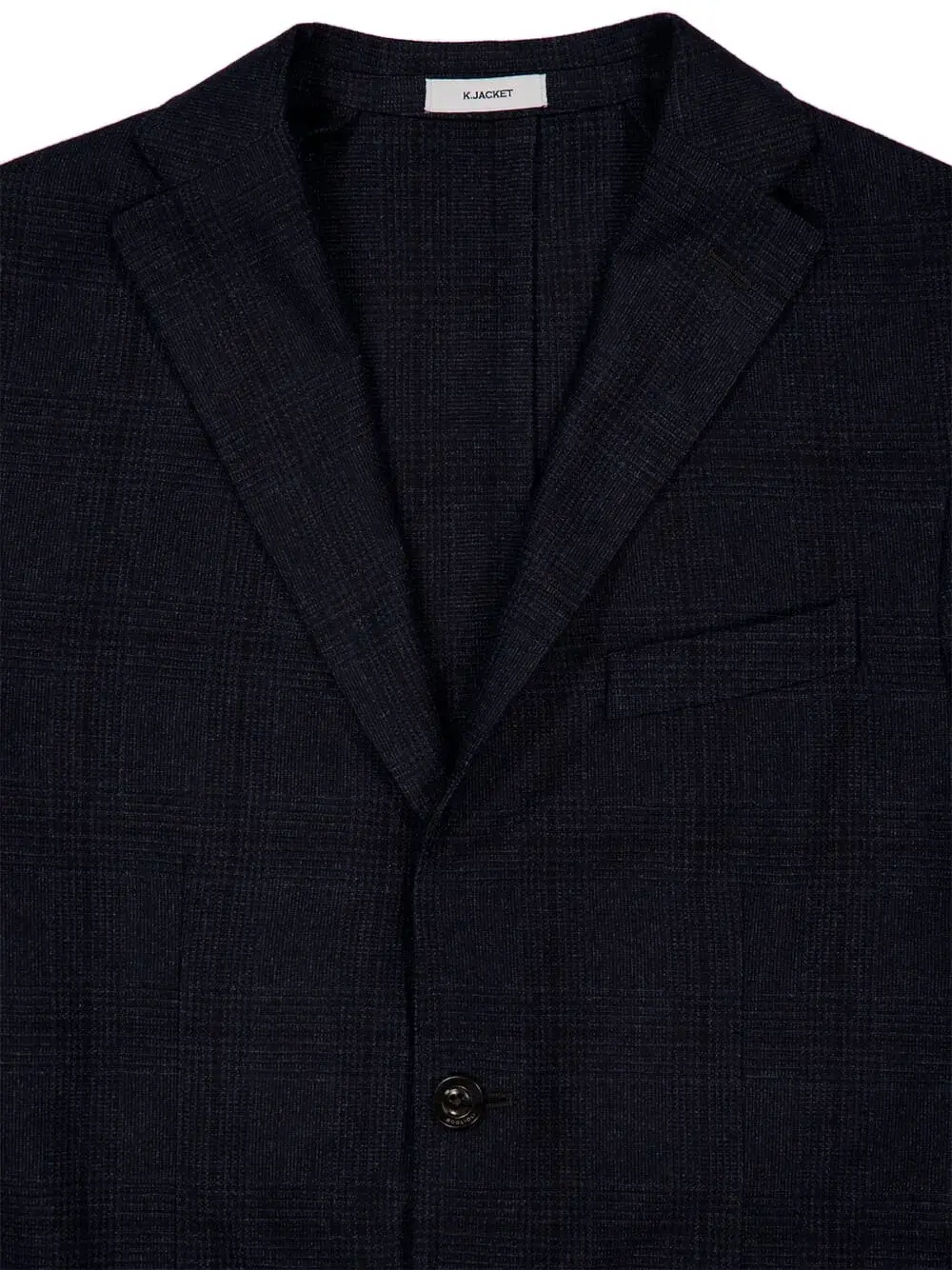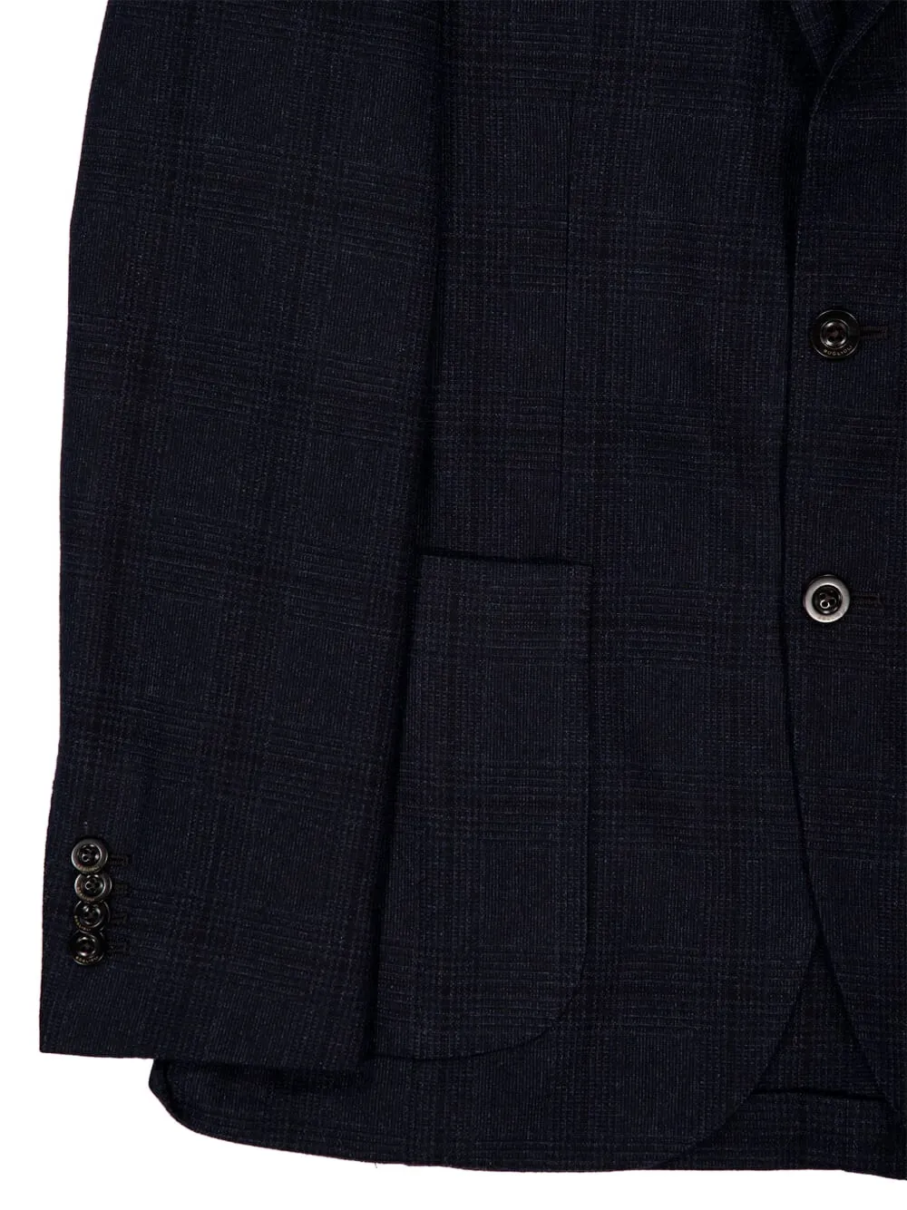 Темно-синий клетчатый узор, застежка на две пуговицы, накладные карманы, длинные рукава