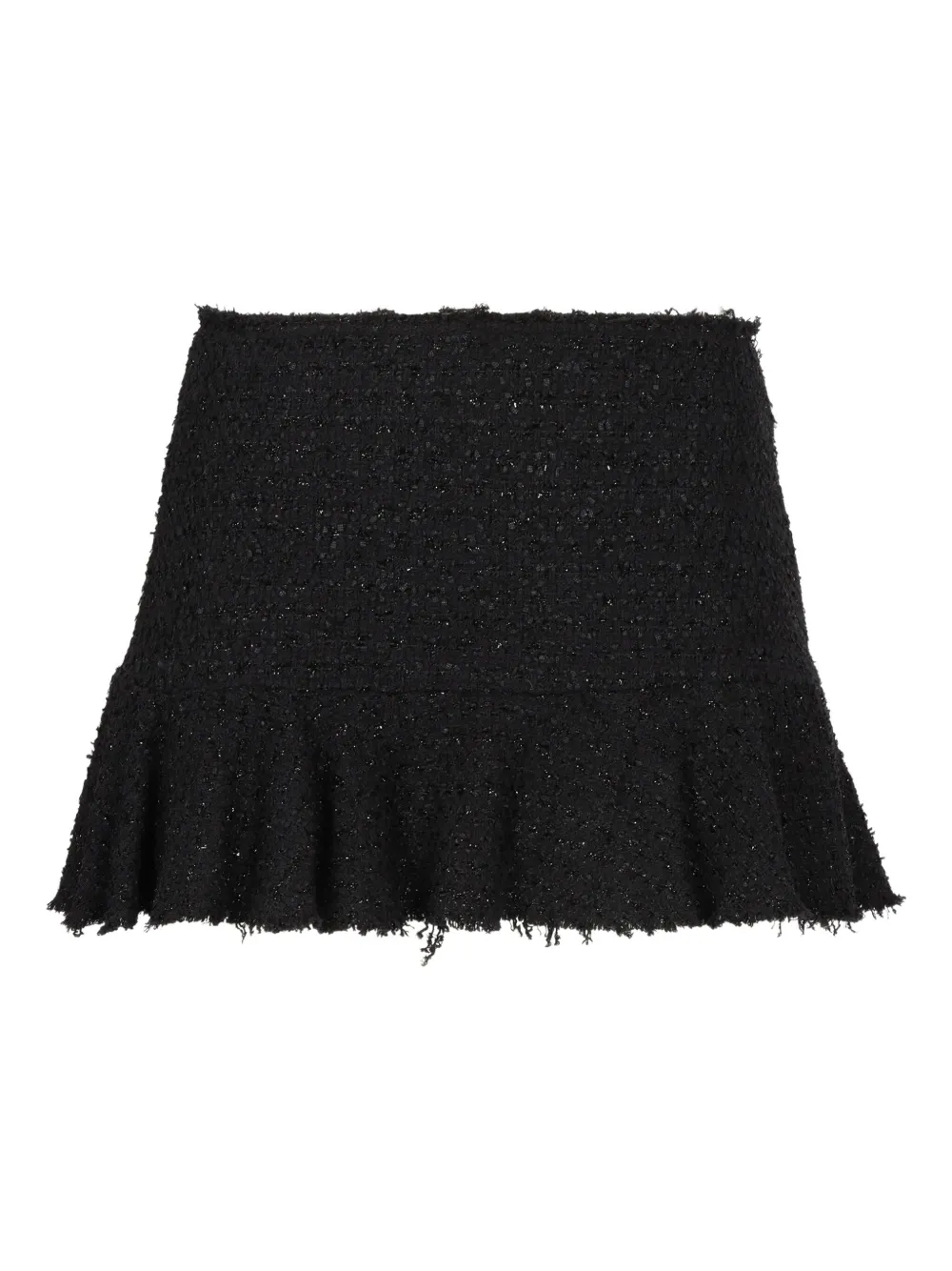 Черный бахромчатый подол, расклешенные оборки, фактурная отделка, высокая талия