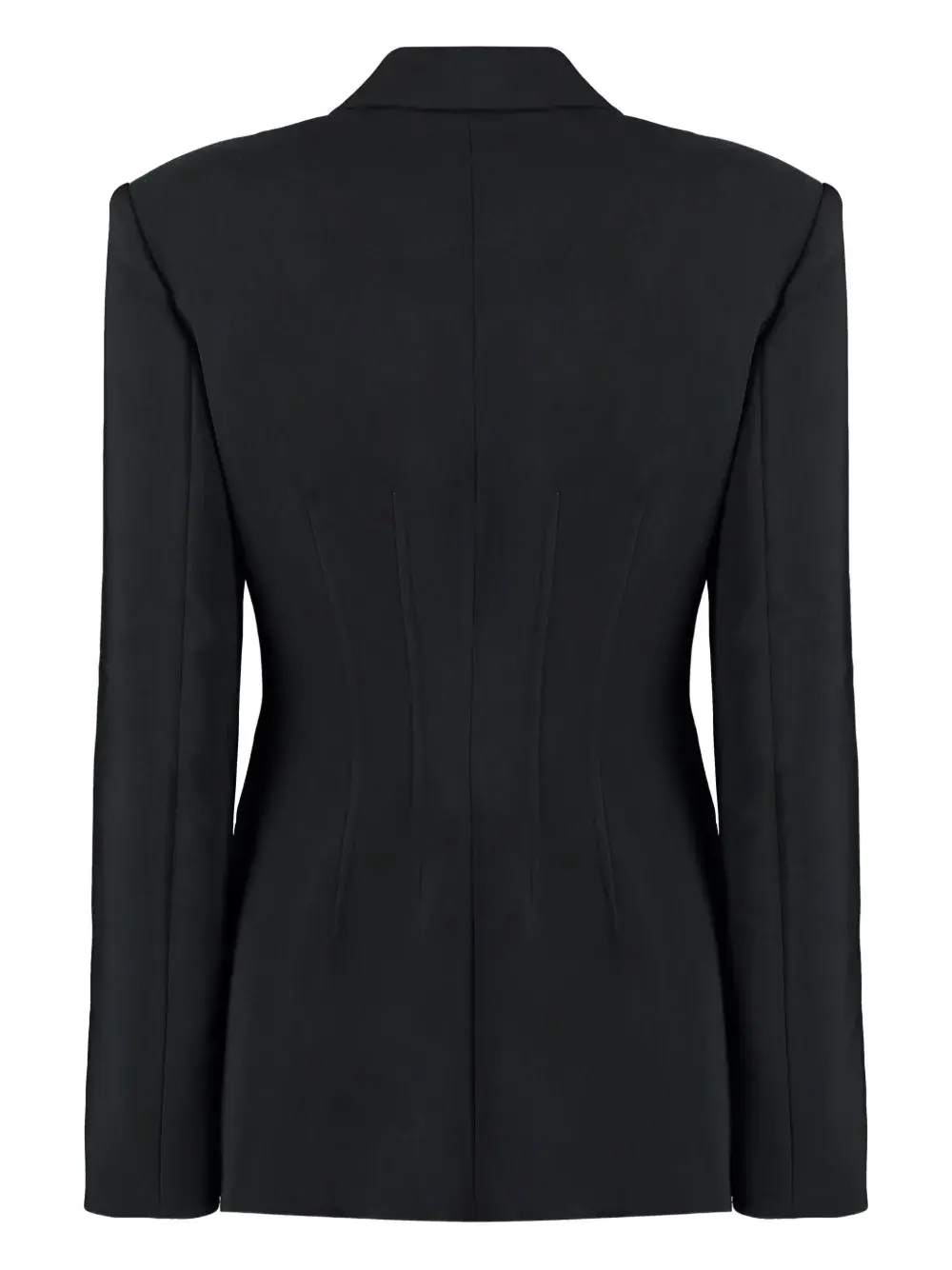 Черные заостренные лацканы, застежка на крючок, прорезные передние карманы, длинные рукава