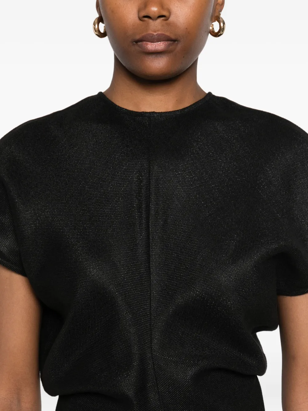 Черные короткие рукава, круглый вырез, присборенная талия, длина миди
