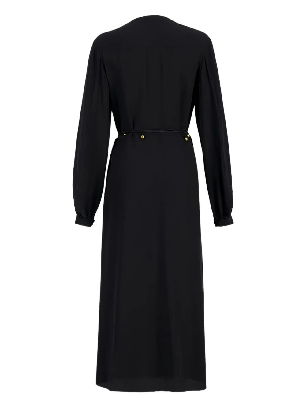 Черный V-образный вырез, длинные рукава, манжеты на пуговицах, пояс с бисером, длина миди