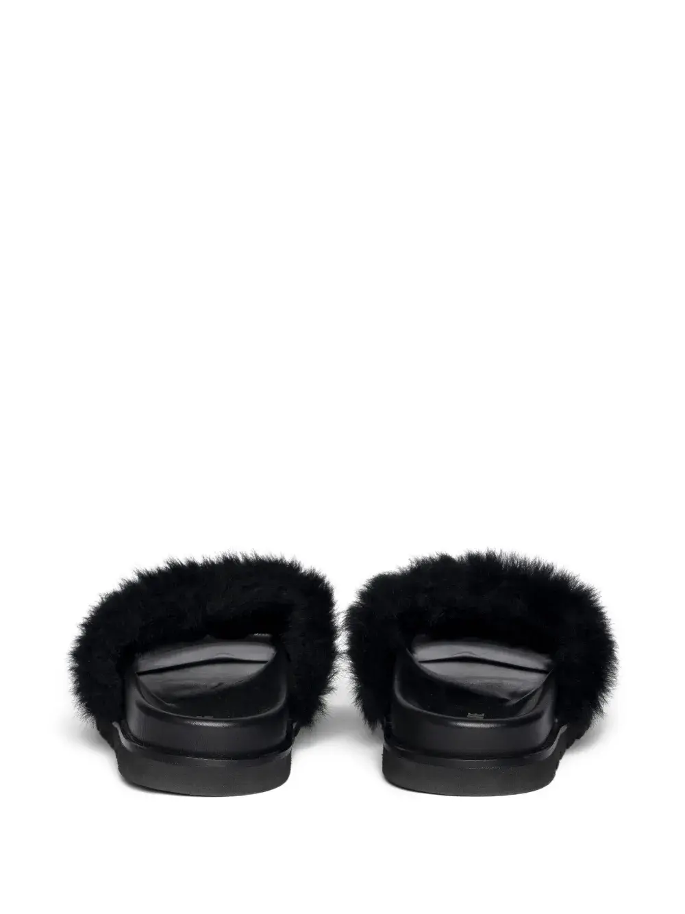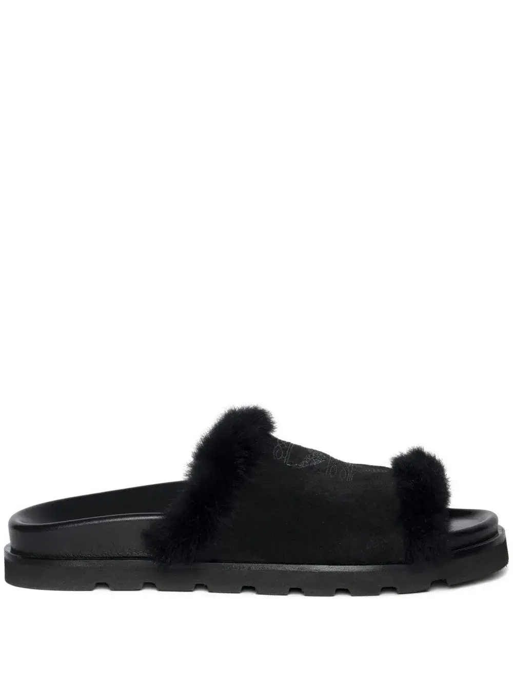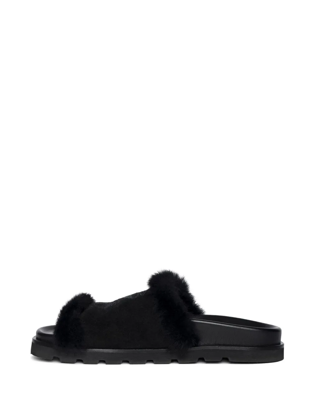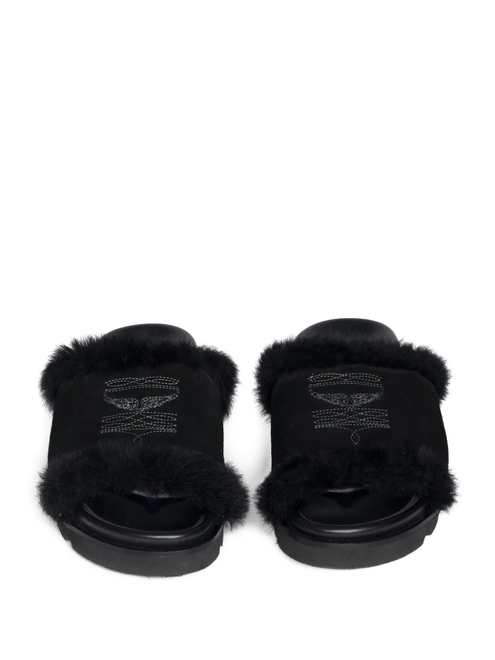 Верх из черной кожи, отделка из овчины, открытый носок, плоская подошва, вышитая деталь