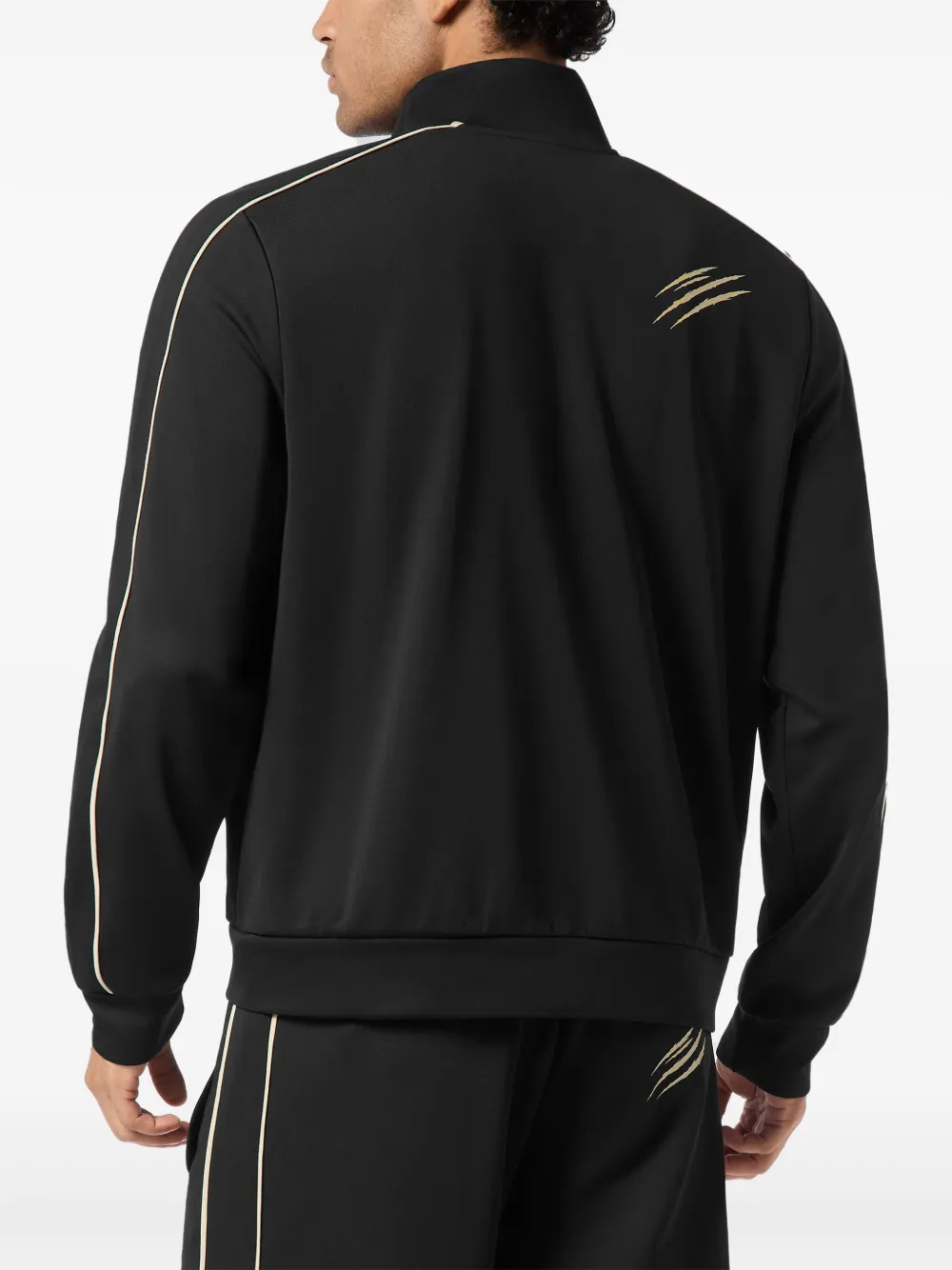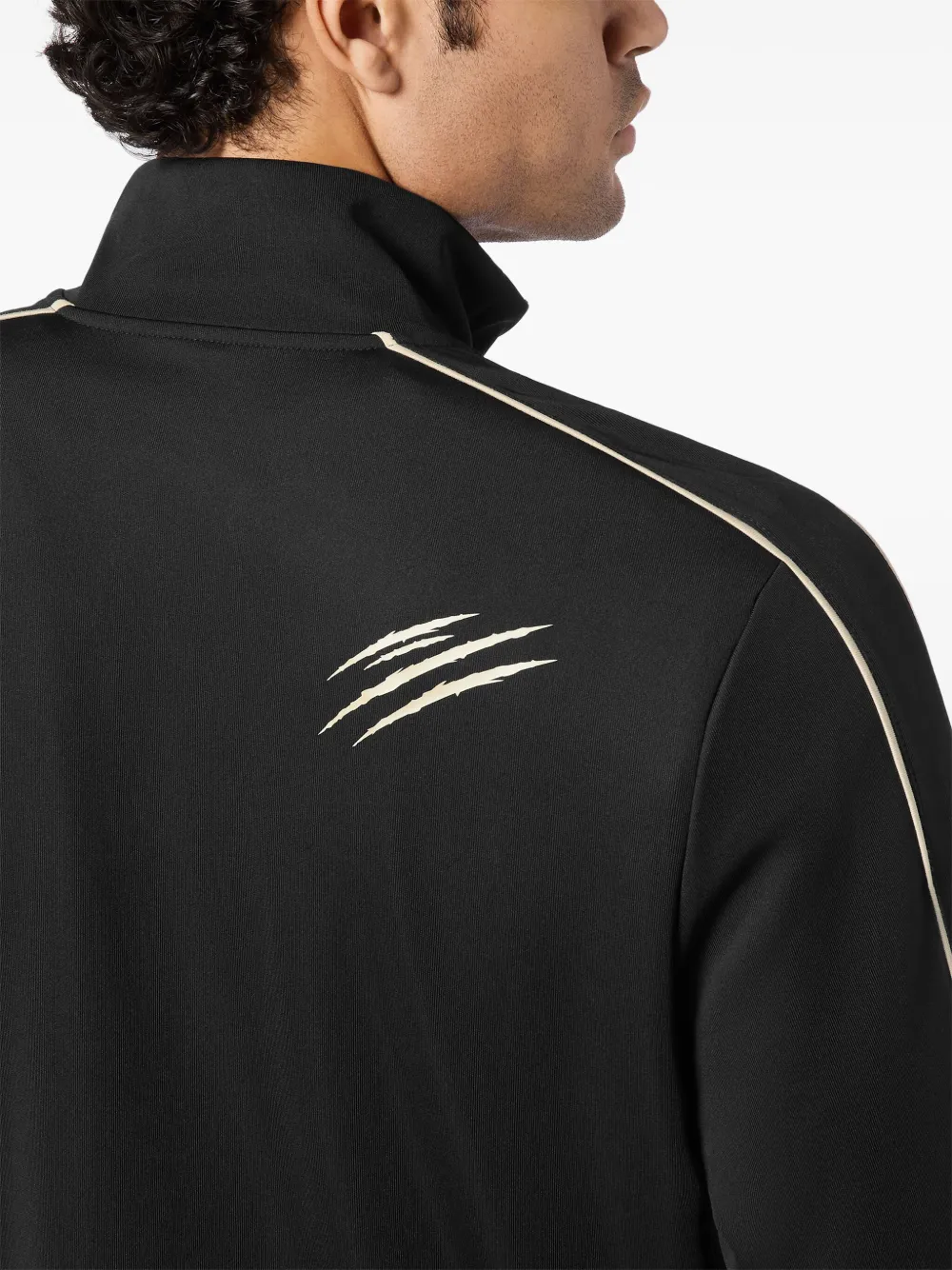Черная застежка-молния спереди, высокий ворот, длинные рукава, логотип на груди