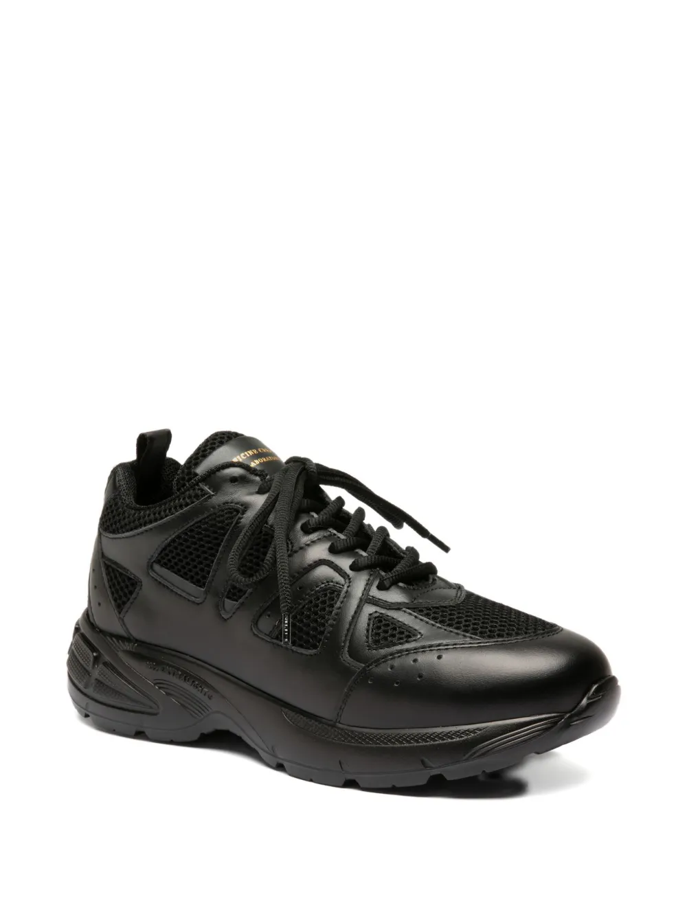 Черная кожаная конструкция, сетчатые панели, шнуровка, массивная подошва, мягкий язычок