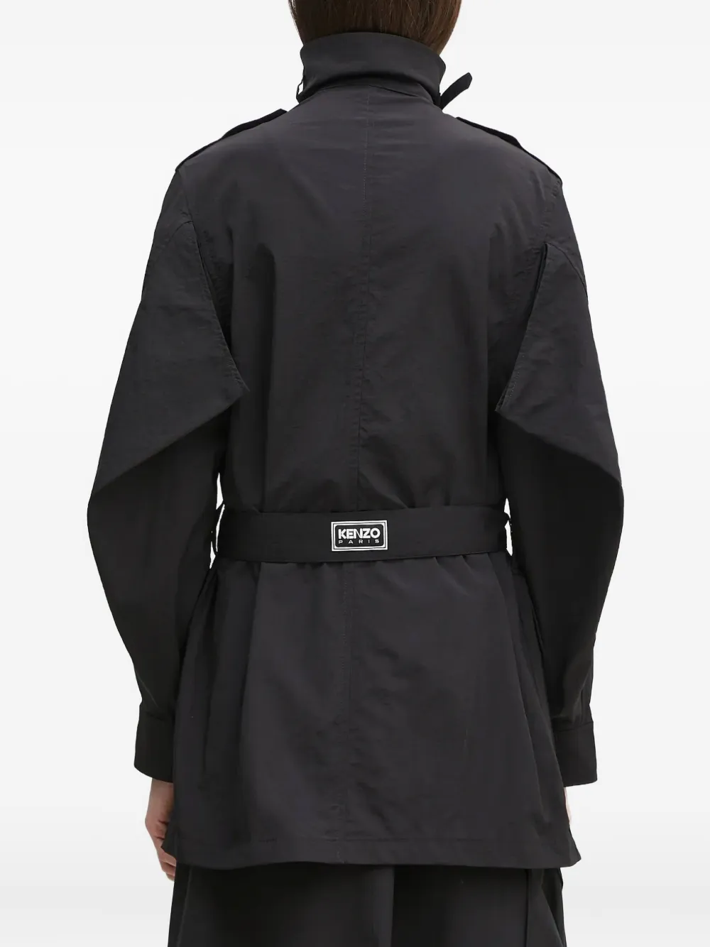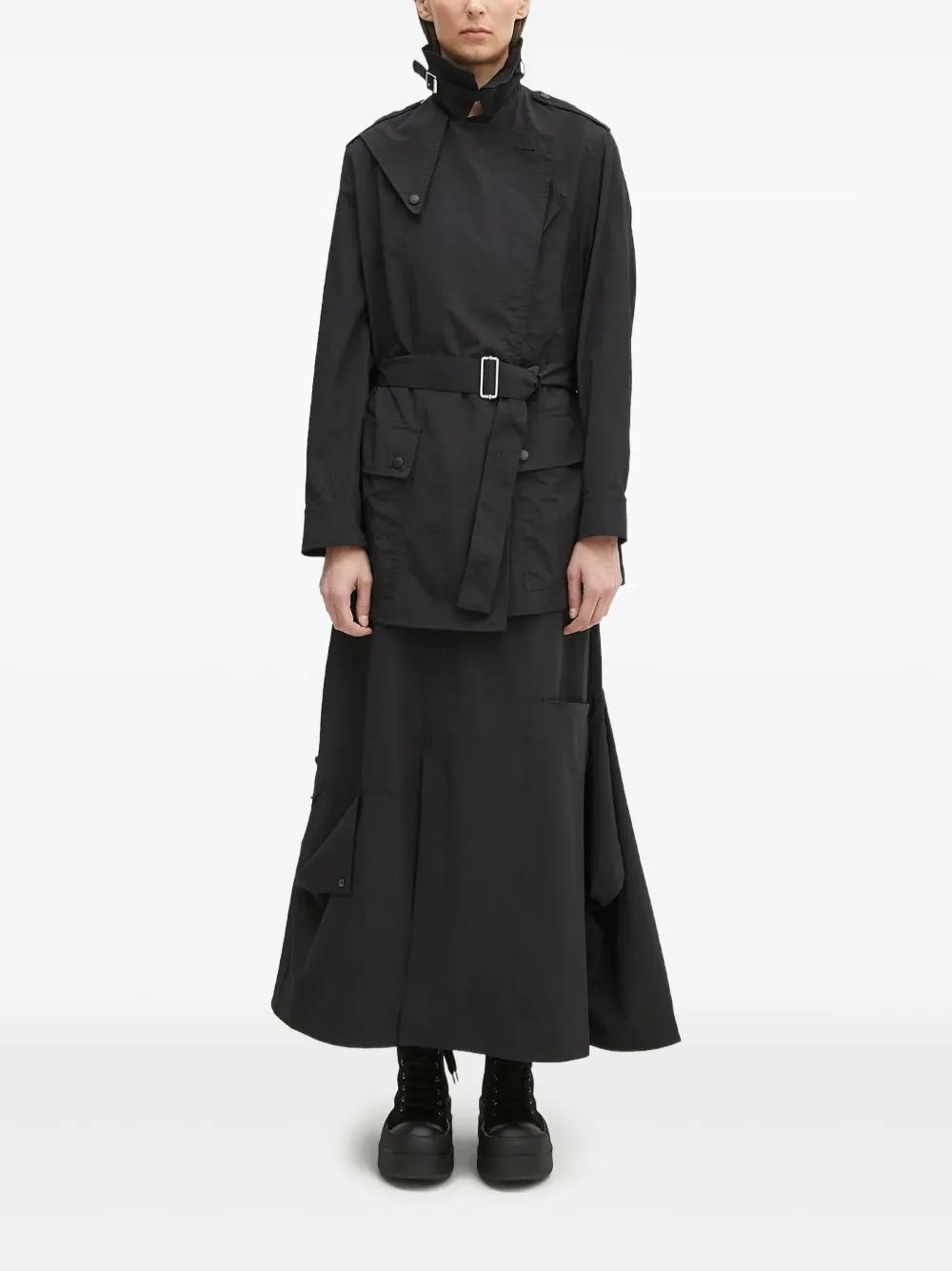 Черный пояс с завязкой, карманы с клапанами, асимметричный дизайн