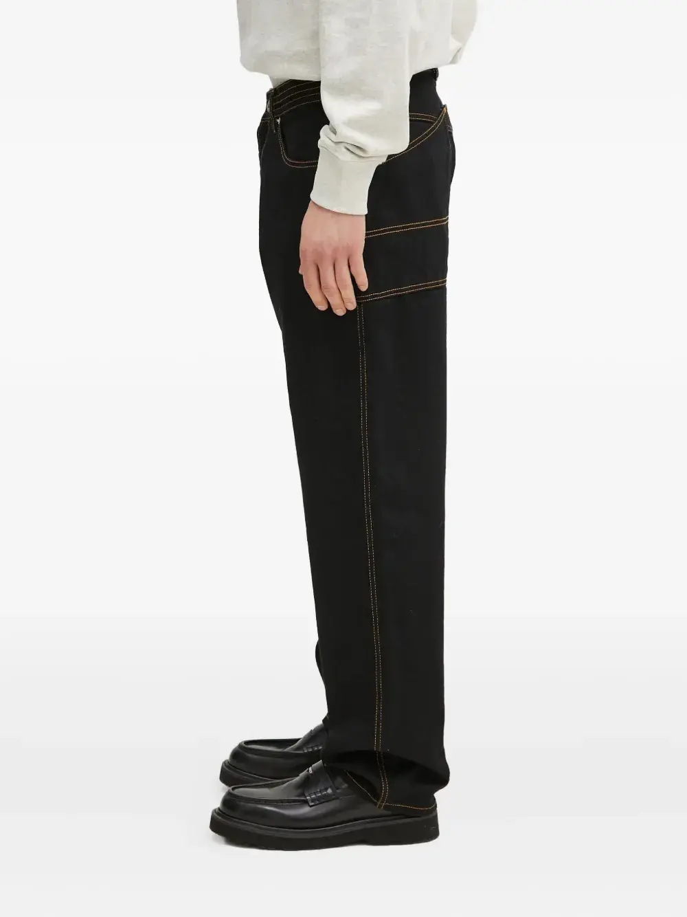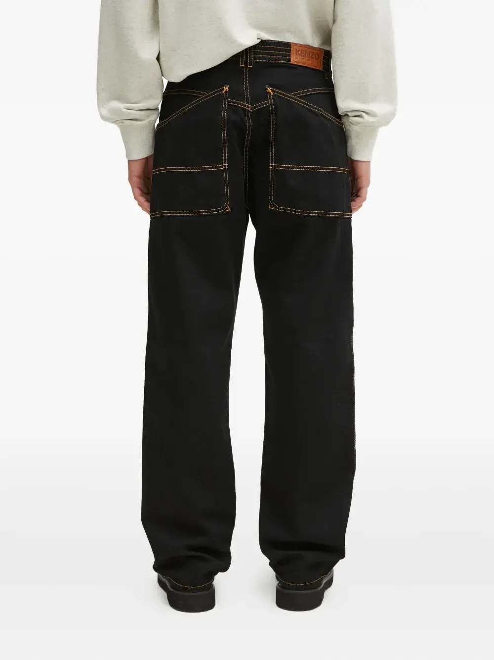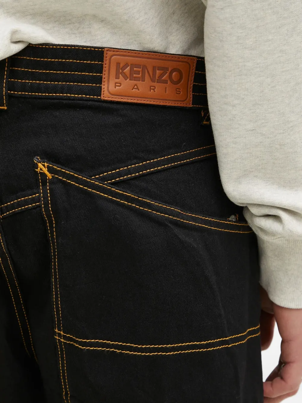 Черная контрастная строчка, пять карманов, застежка на пуговицы, накладной карман сзади