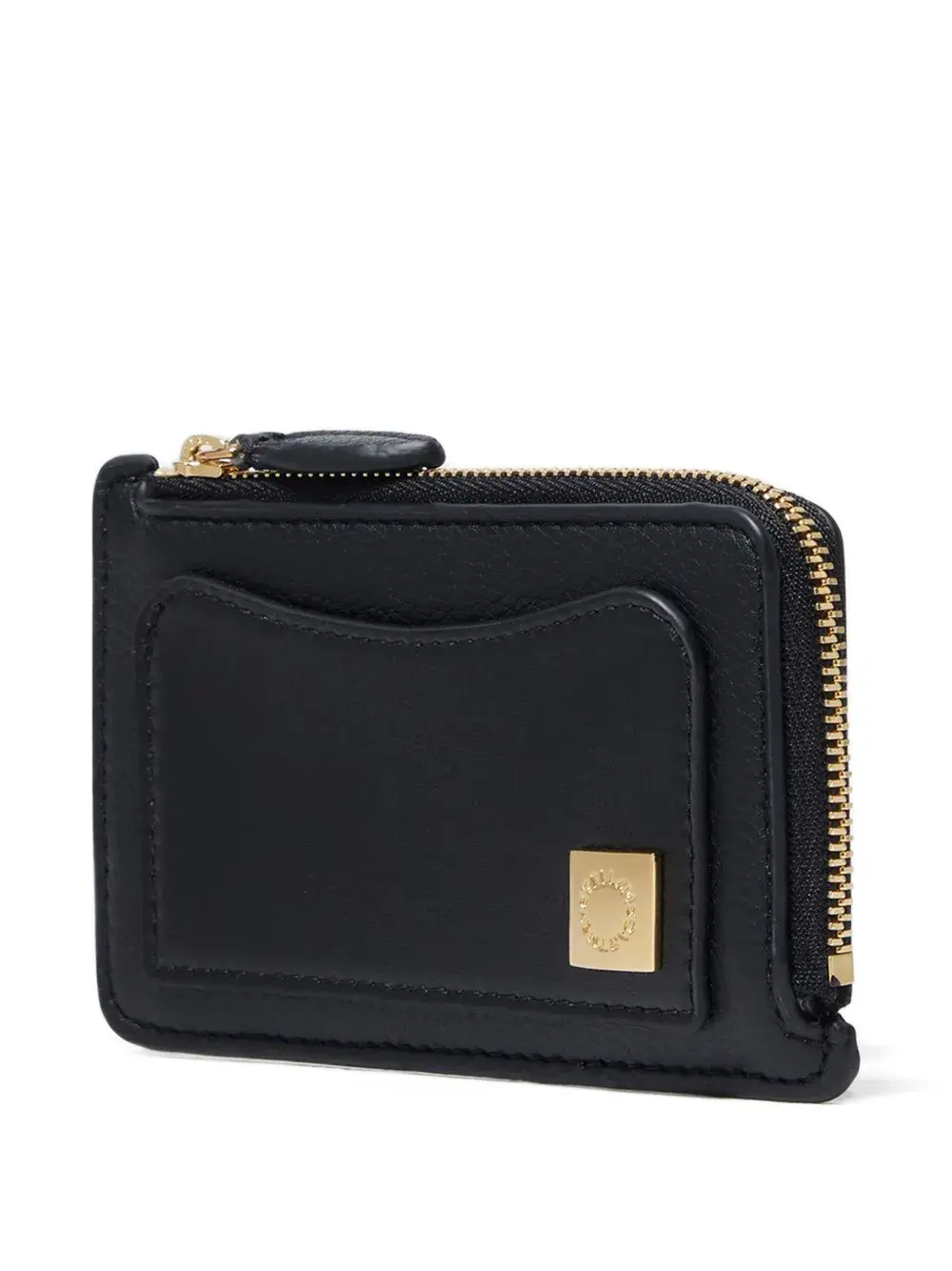 Черная застежка-молния, золотистая фурнитура, бляшка с логотипом, отделения для карт
