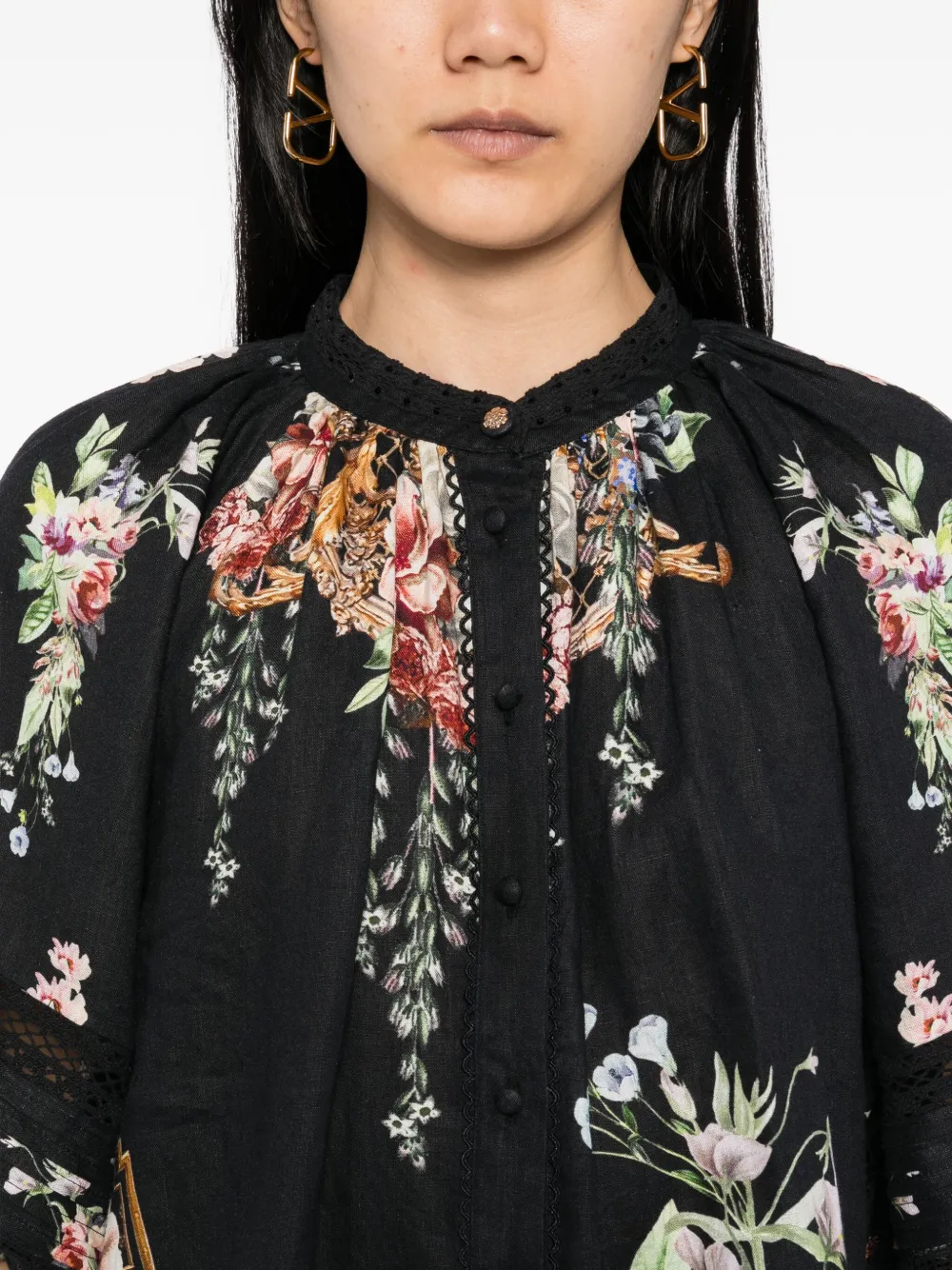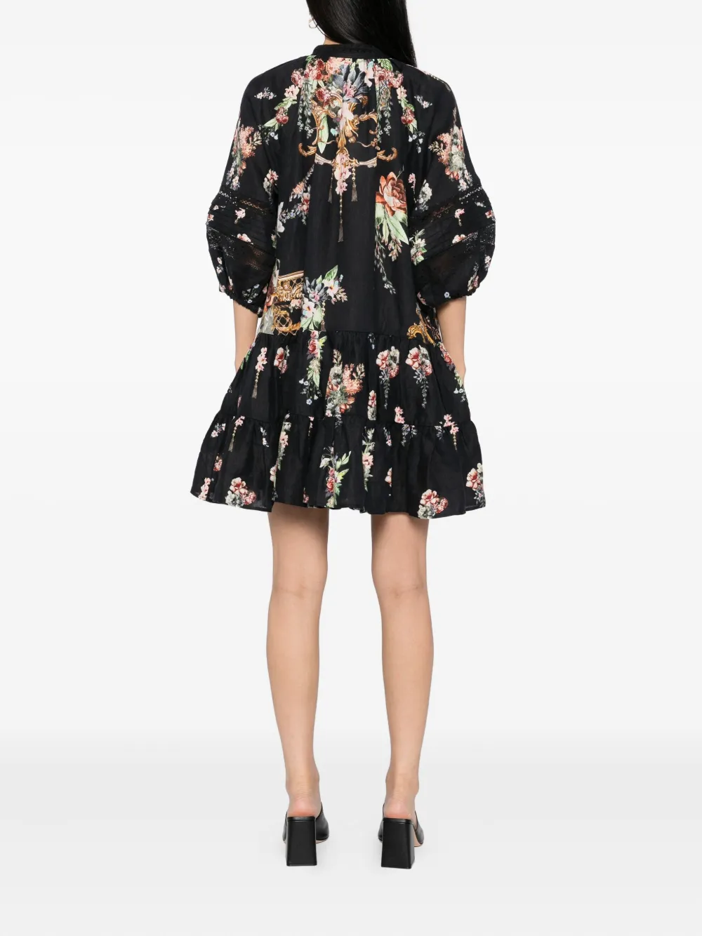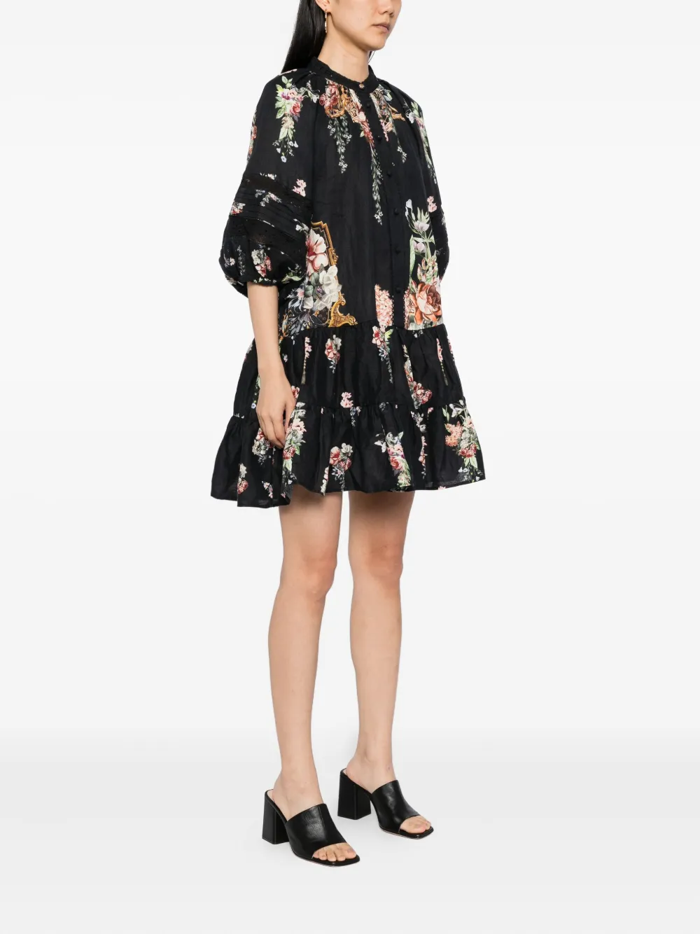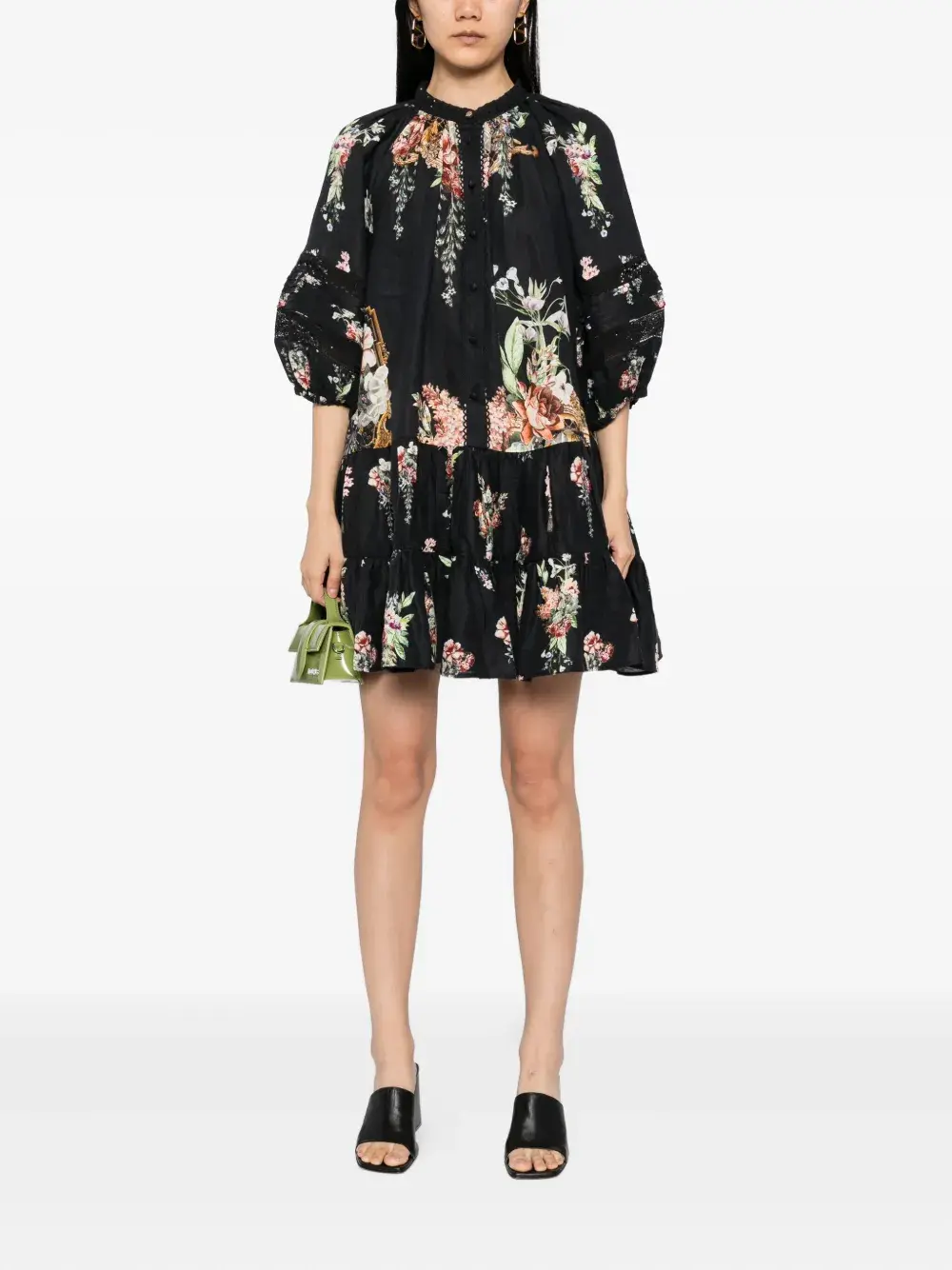 Черная застежка на пуговицы спереди, круглый вырез горловины, рукава-буфы длиной три четверти, два боковых врезных кармана