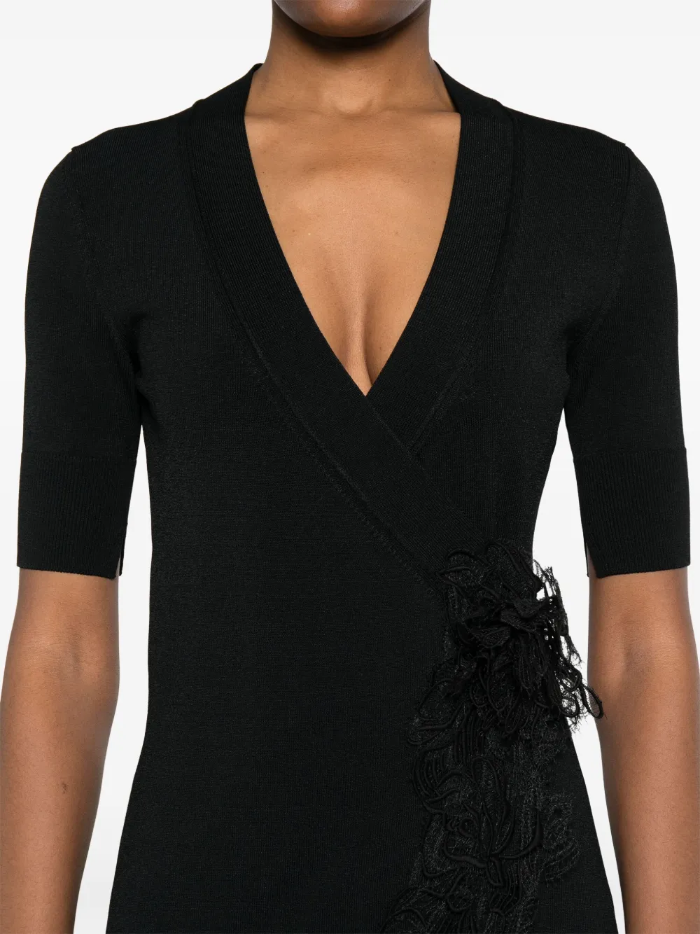 Черный дизайн с запахом, цветочная аппликация, глубокий V-образный вырез, короткие рукава
