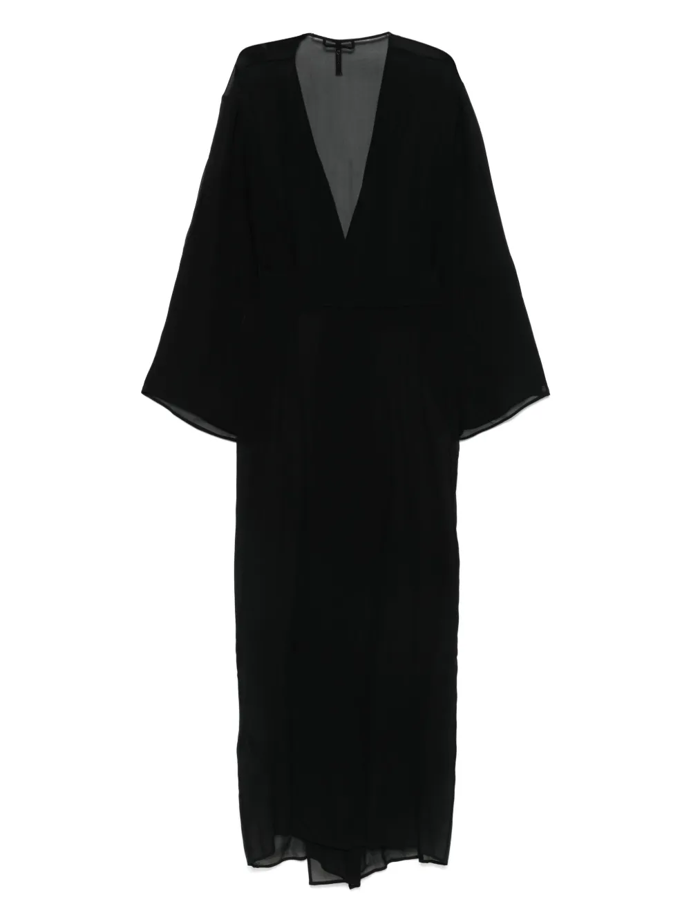 Черный V-образный вырез, длинные рукава, полупрозрачная конструкция, съемный и регулируемый пояс на талии, расклешенный подол