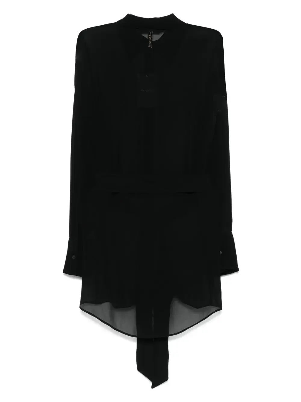 Черная застежка на пуговицы спереди, классический воротник, длинные рукава, полупрозрачная конструкция, съемный и регулируемый пояс на талии, закругленный подол