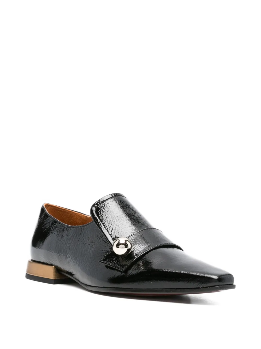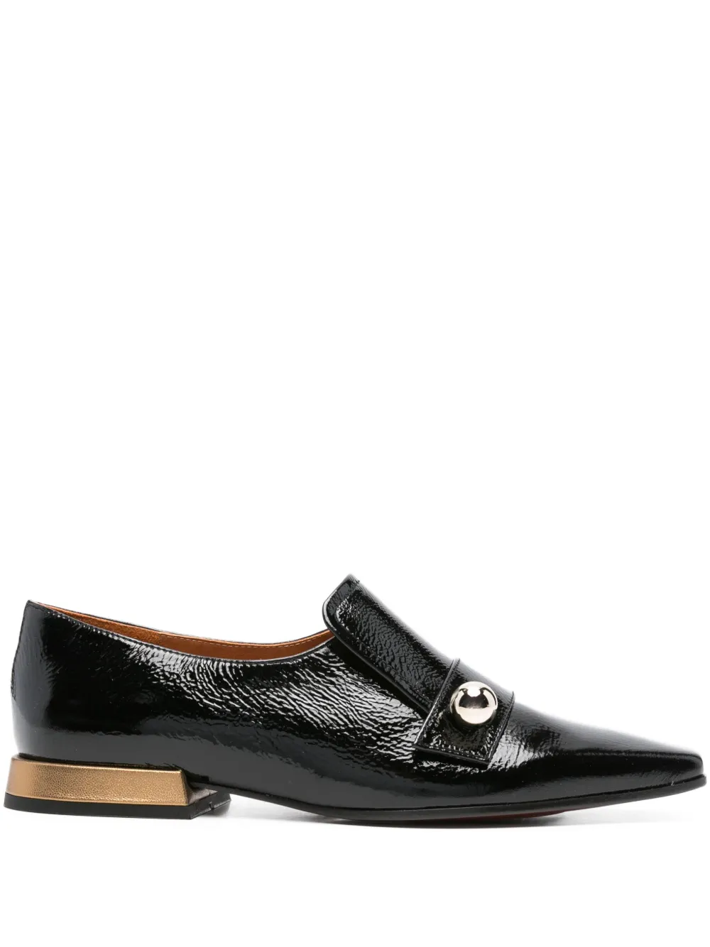 Черные лакированные туфли с острым квадратным носком, золотистый каблук, одинарный ремешок, декоративное украшение в виде шарика