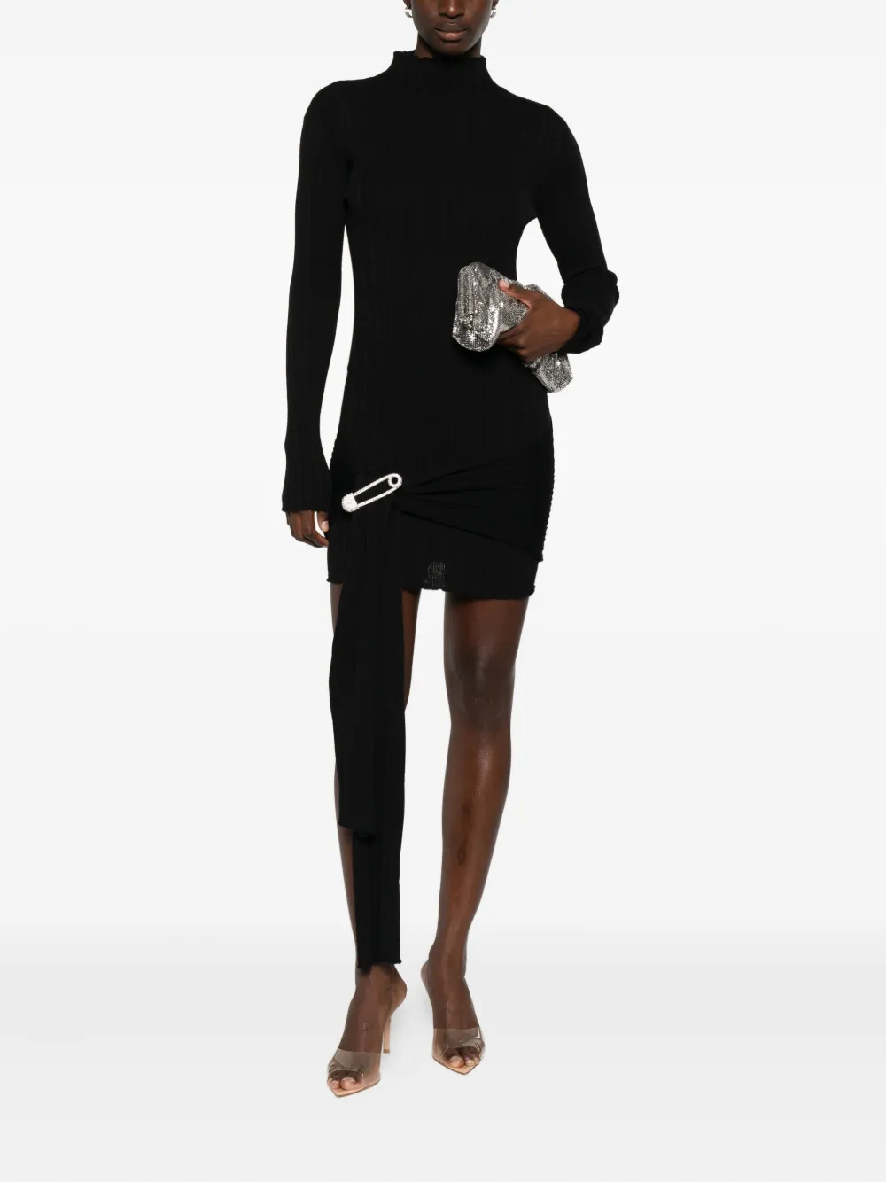 Черный ребристая вязка, высокий ворот, отделка булавками, драпированная талия, длинные рукава