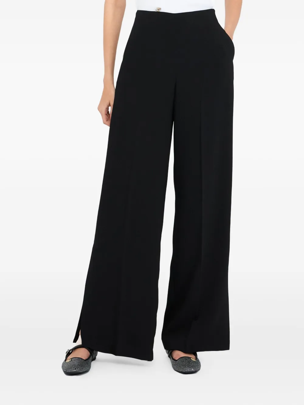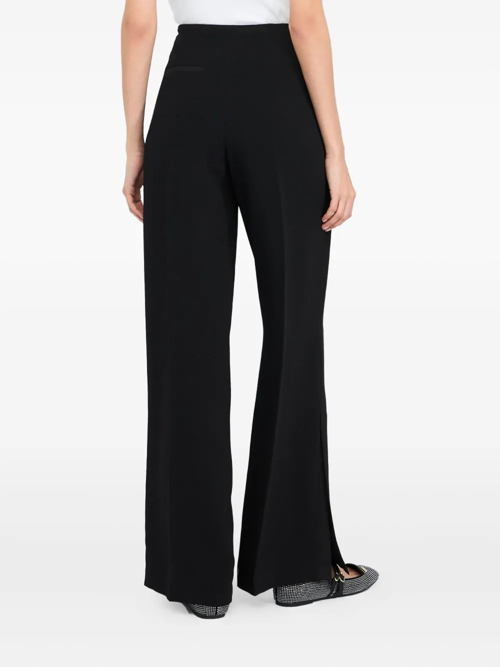 Черная высокая талия, заутюженная складка, прорезной карман сзади, разрезы по подолу, потайная застежка-молния сбоку