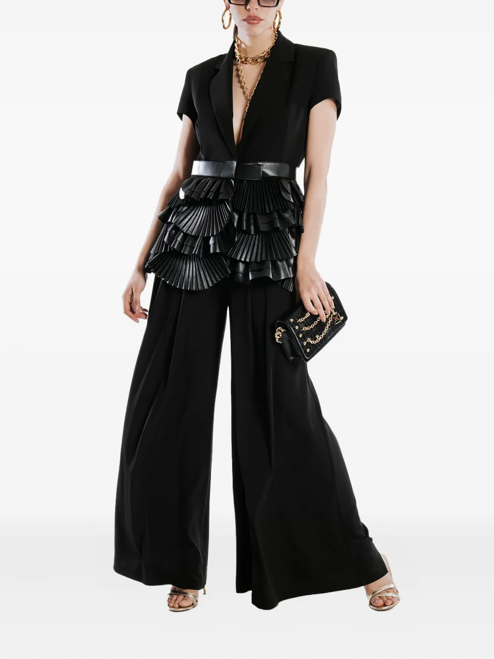 Черная плиссированная деталь, отделка из кожи, высокая талия, широкие штанины, складки по центру спереди