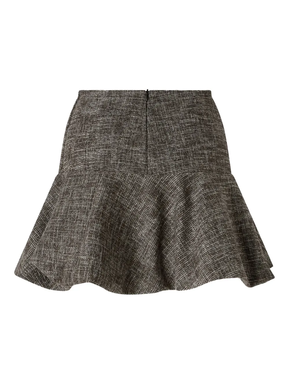 Черно-коричневая твидовая фактура, оборчатый подол, потайная застежка-молния