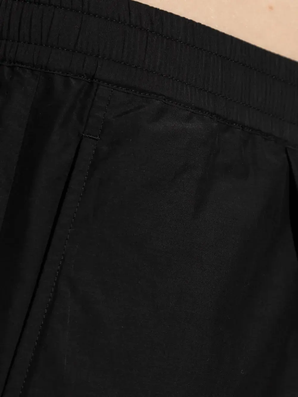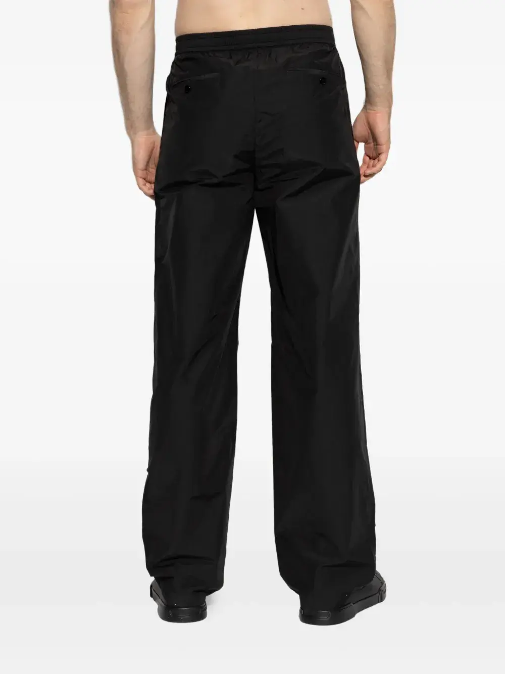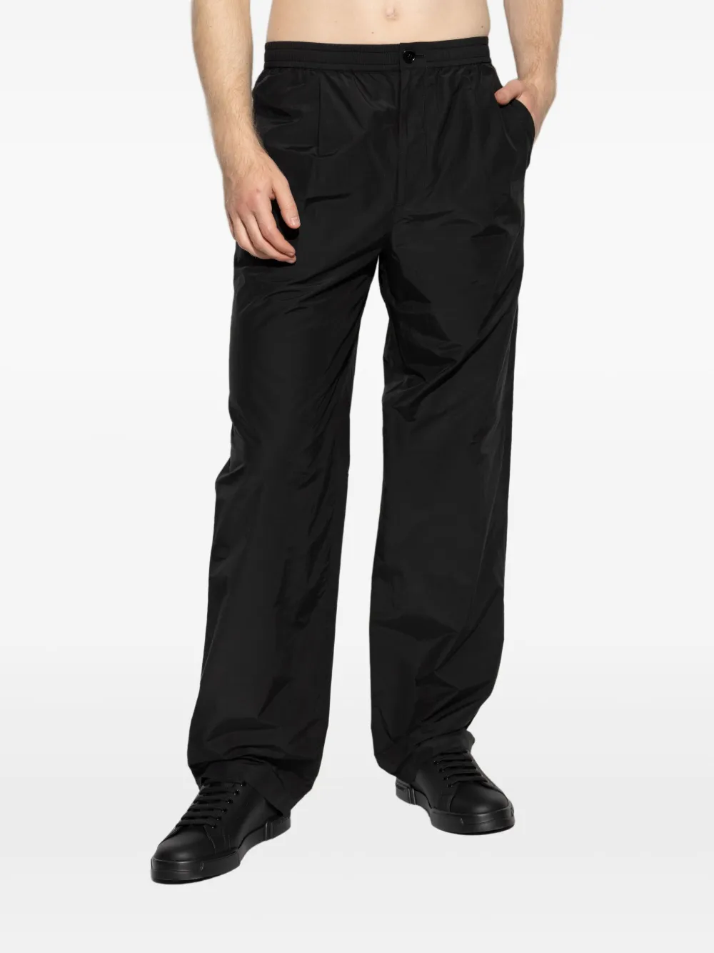 Черные складки, эластичный пояс, боковые карманы, приталенные штанины, застежка на пуговицы