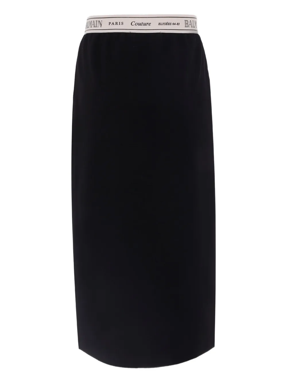 Черный эластичный пояс с логотипом, длина миди, разрезы по бокам