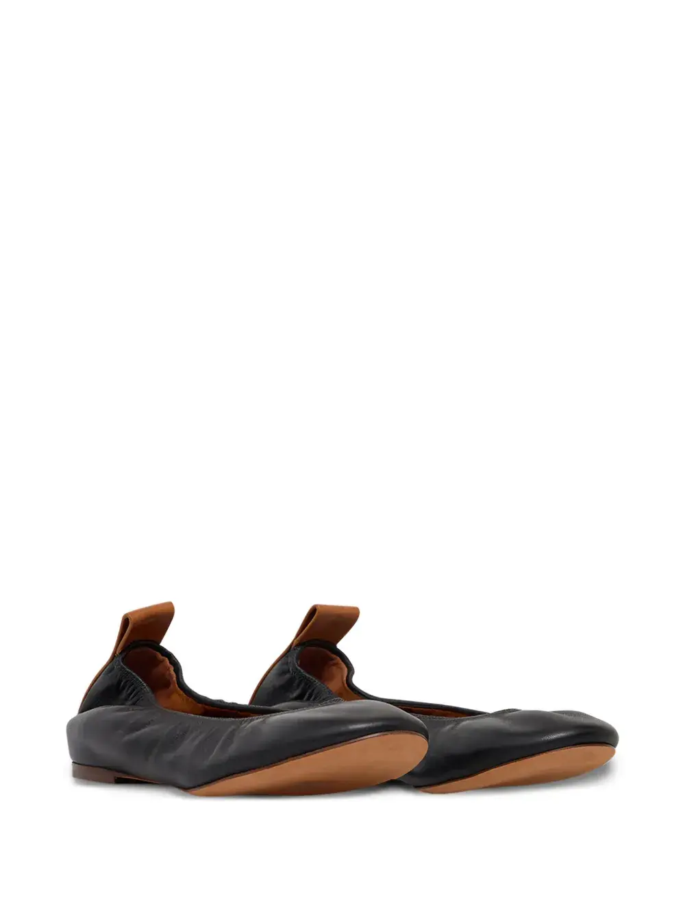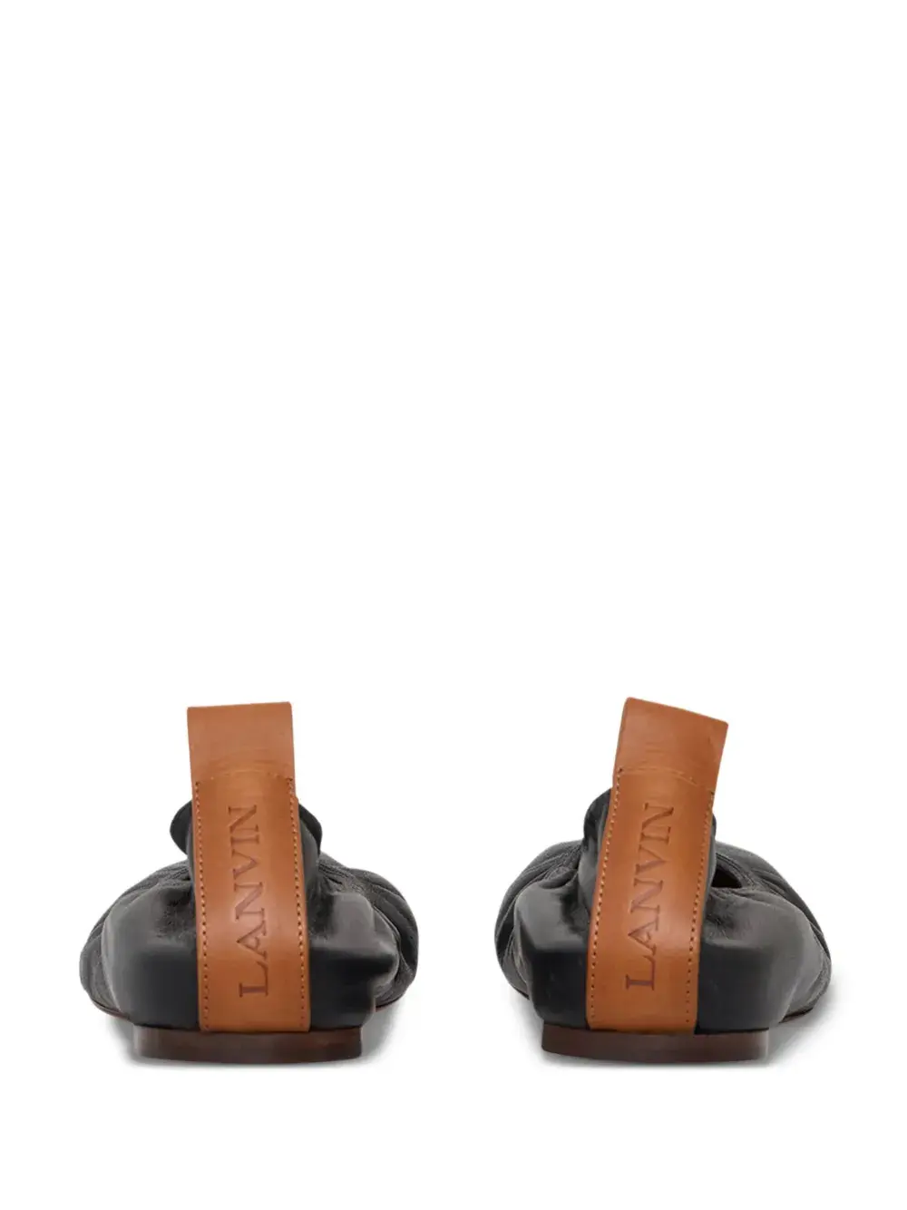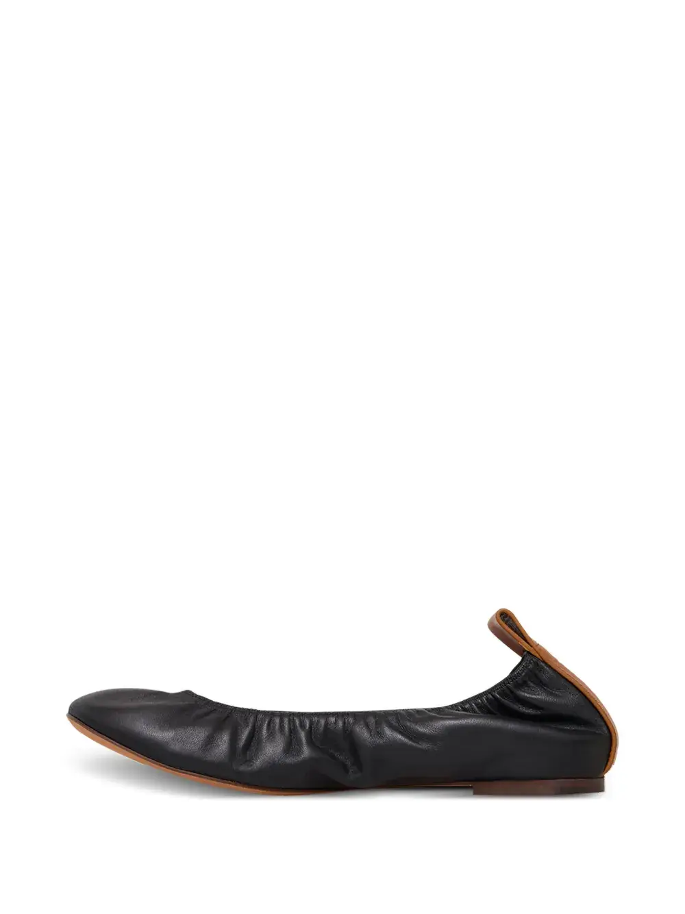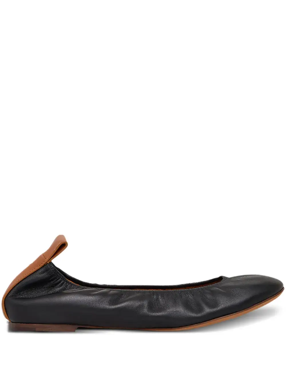 Черные сборчатые детали, миндалевидный носок, контрастный язычок на пятке, плоская подошва