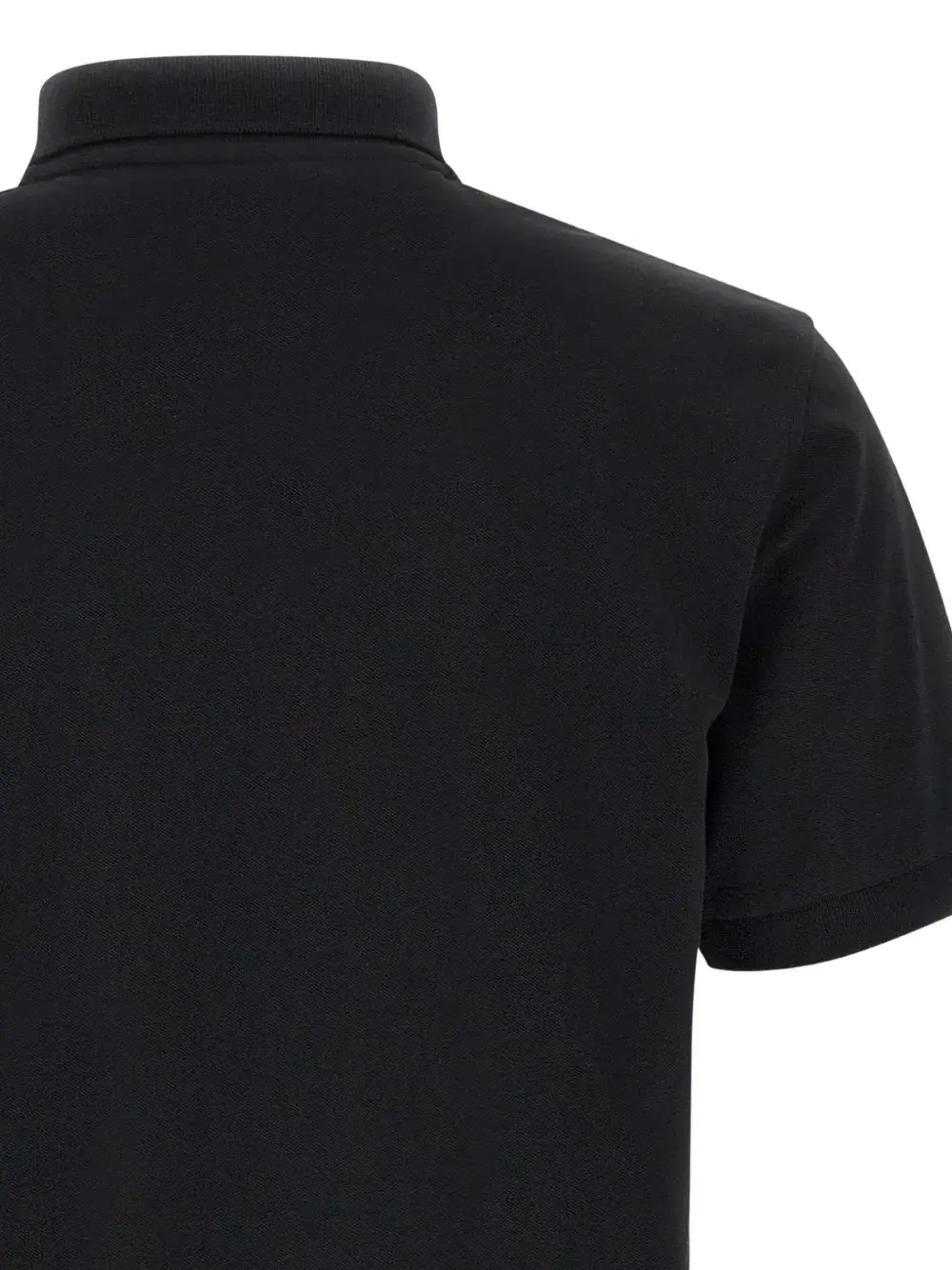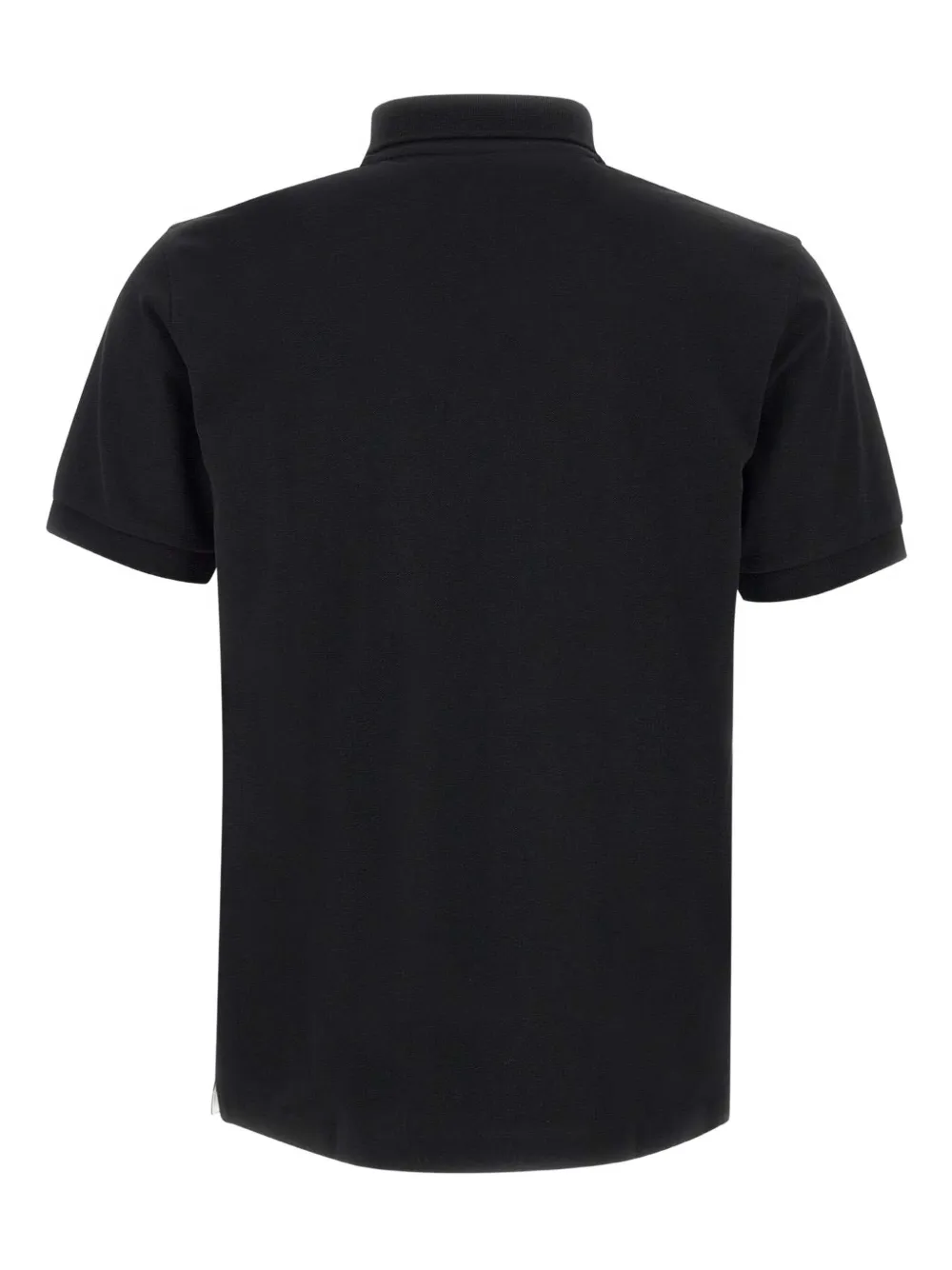 Черные короткие рукава, воротник с планкой на пуговицах, вышитый логотип, прямой подол