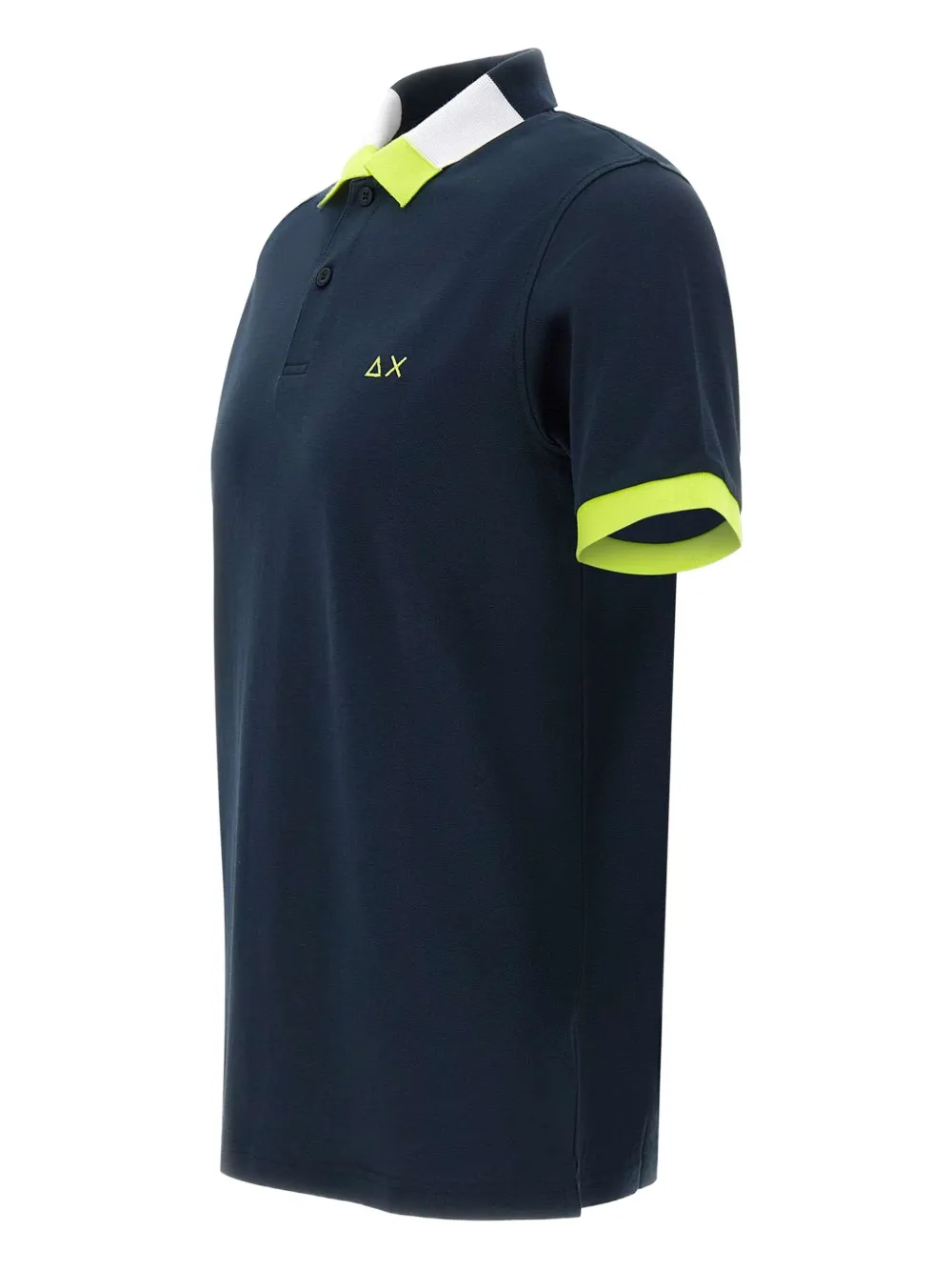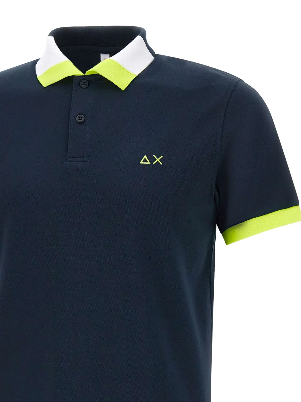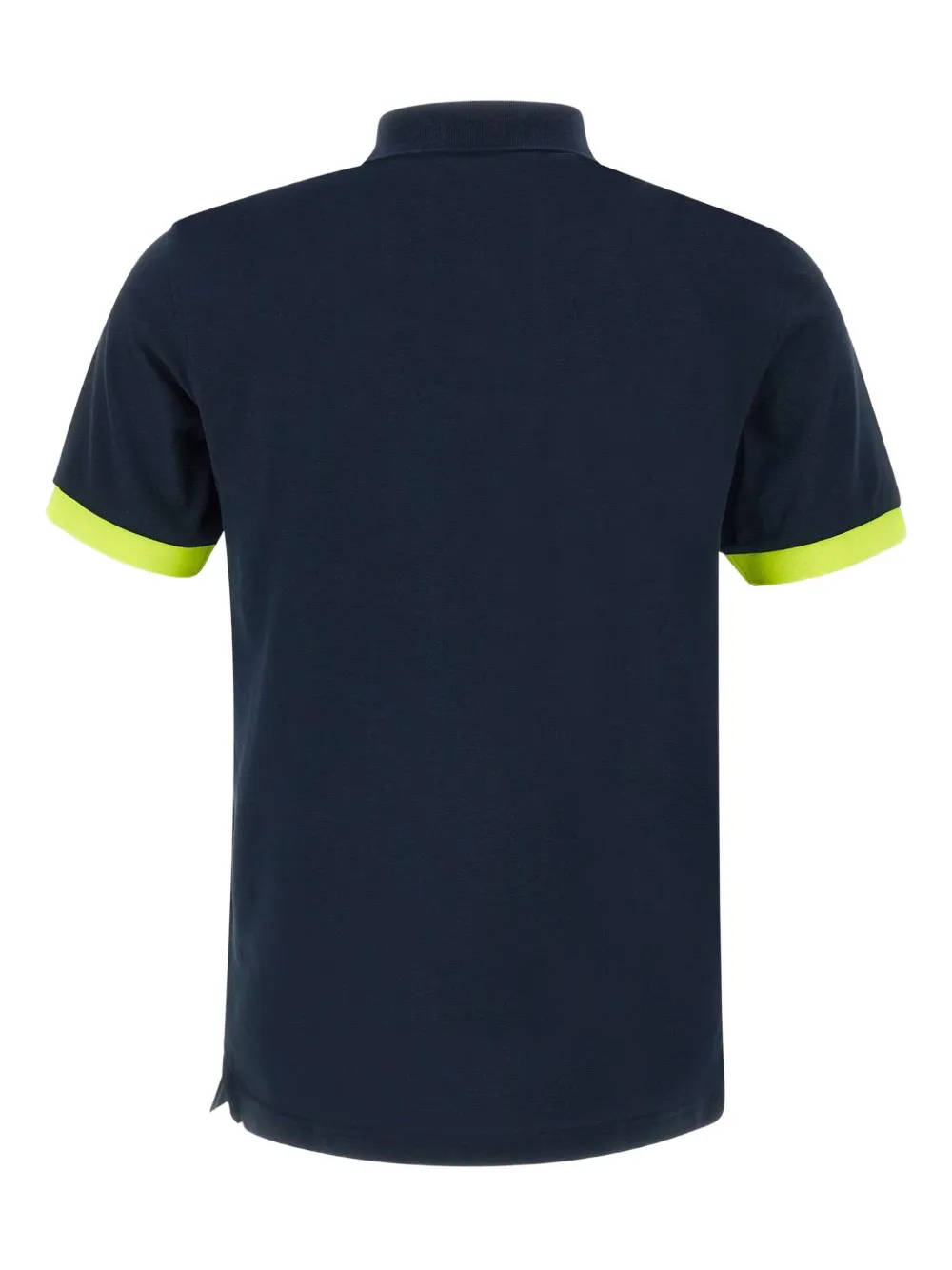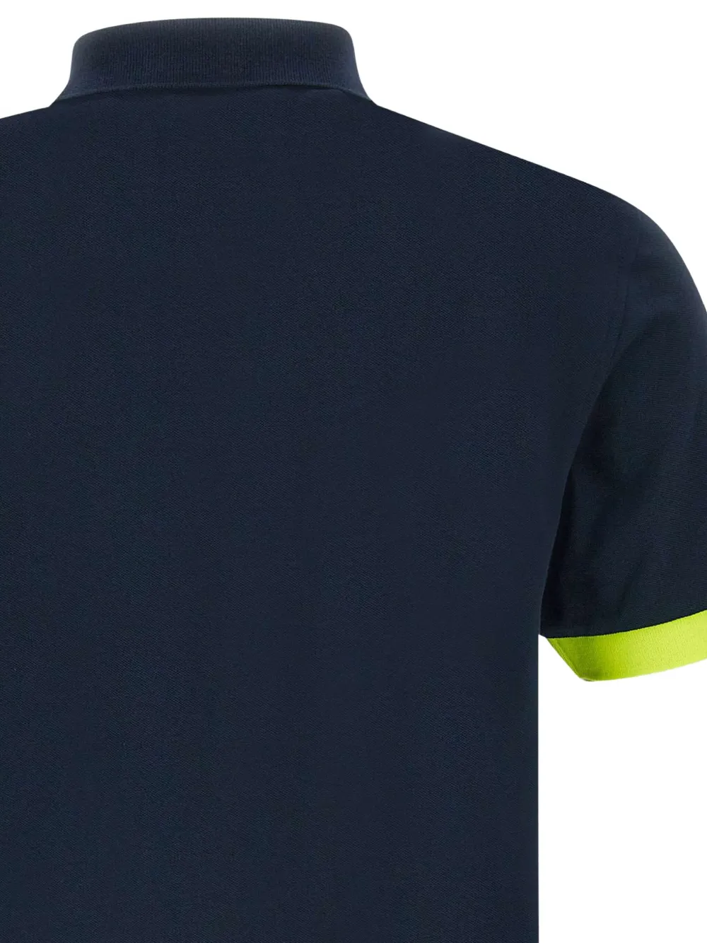 Контрастный воротник темно-синего цвета, неоново-зеленые ребристые манжеты, логотип на груди, планка с тремя пуговицами, короткие рукава