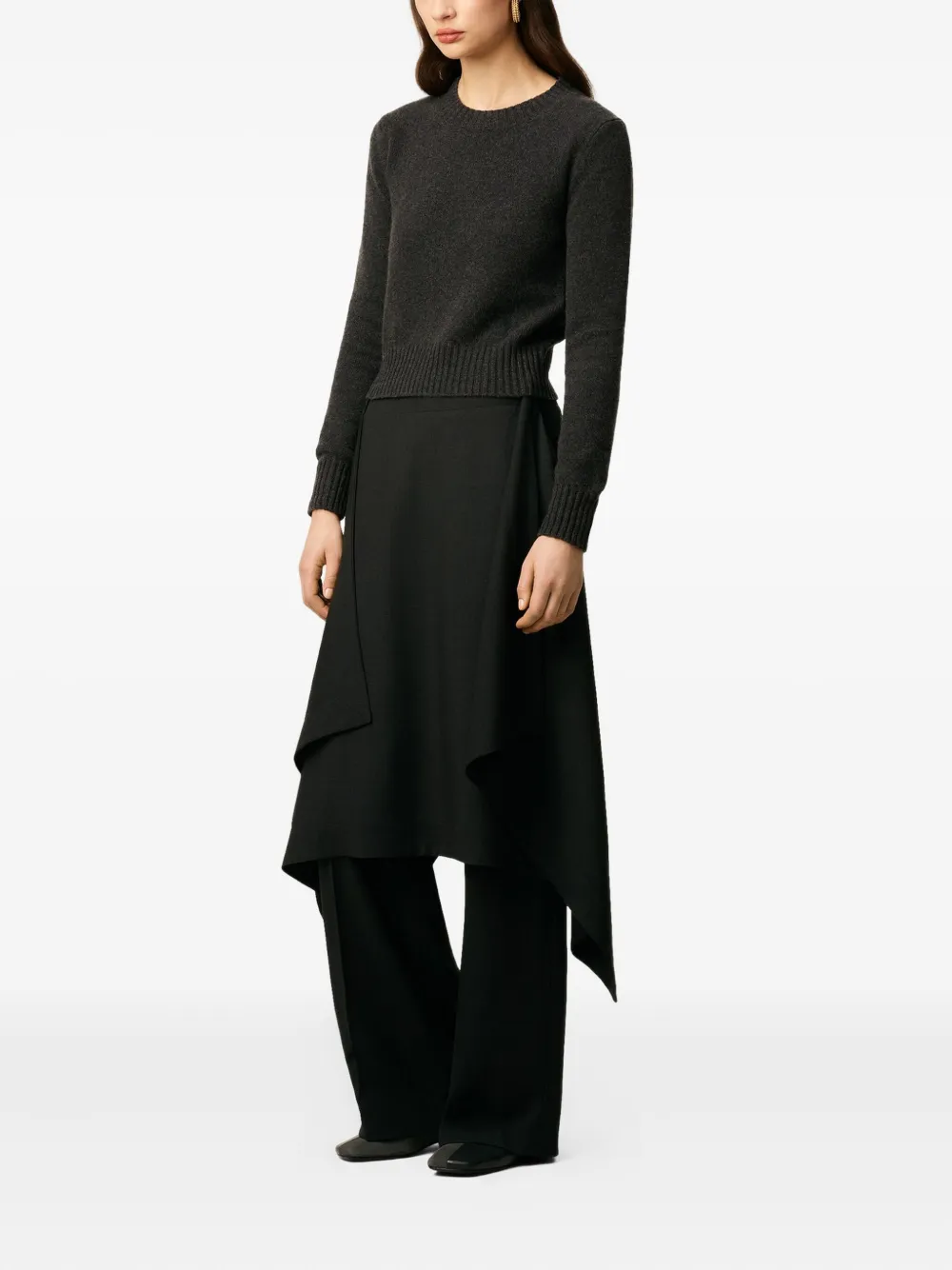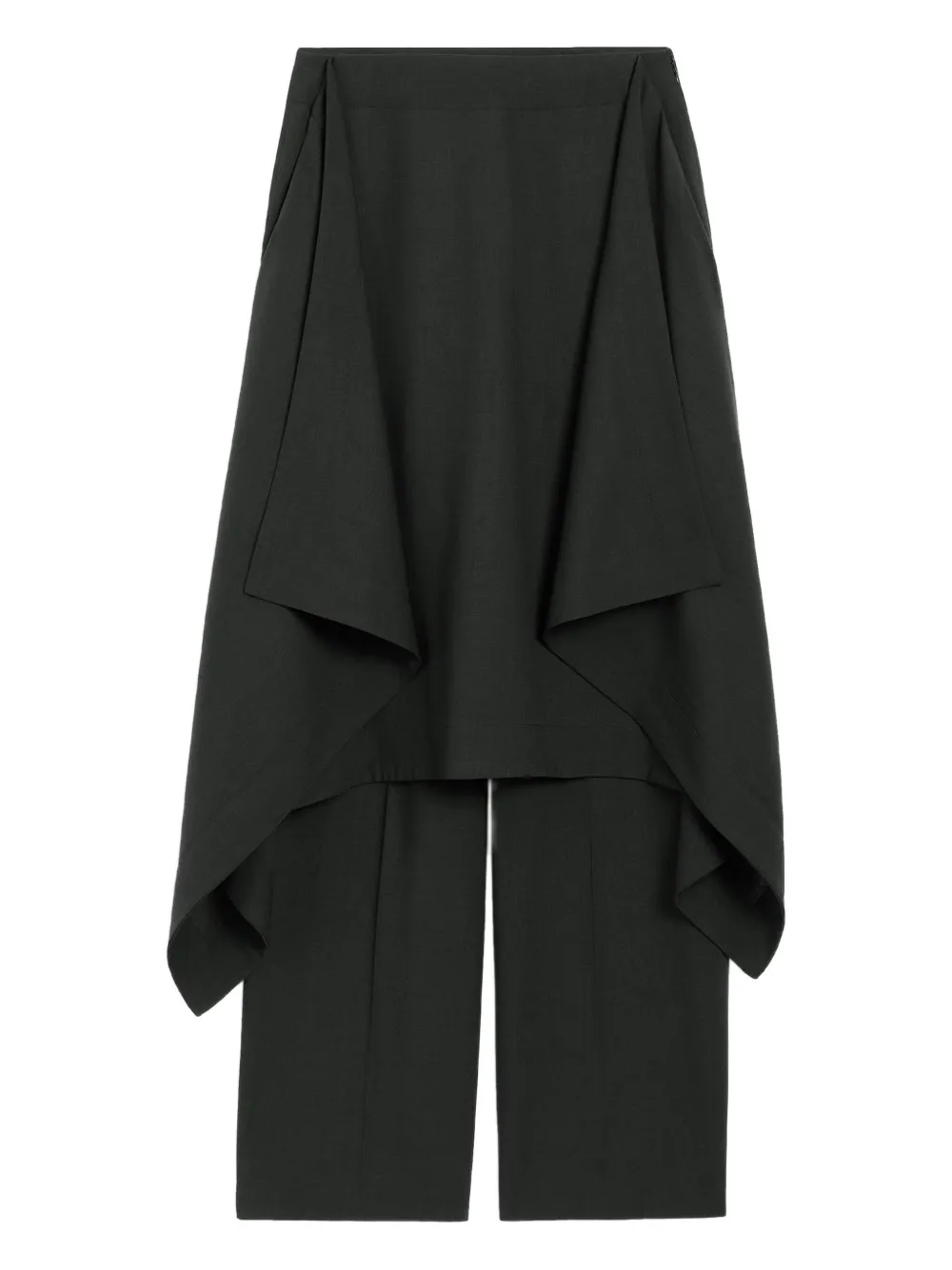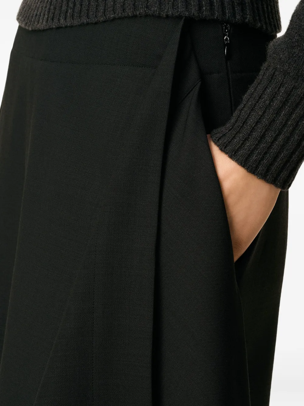 Асимметричная драпировка из черной шерстяной саржи, потайная застежка-молния, вшитая в пояс, боковые прорезные карманы