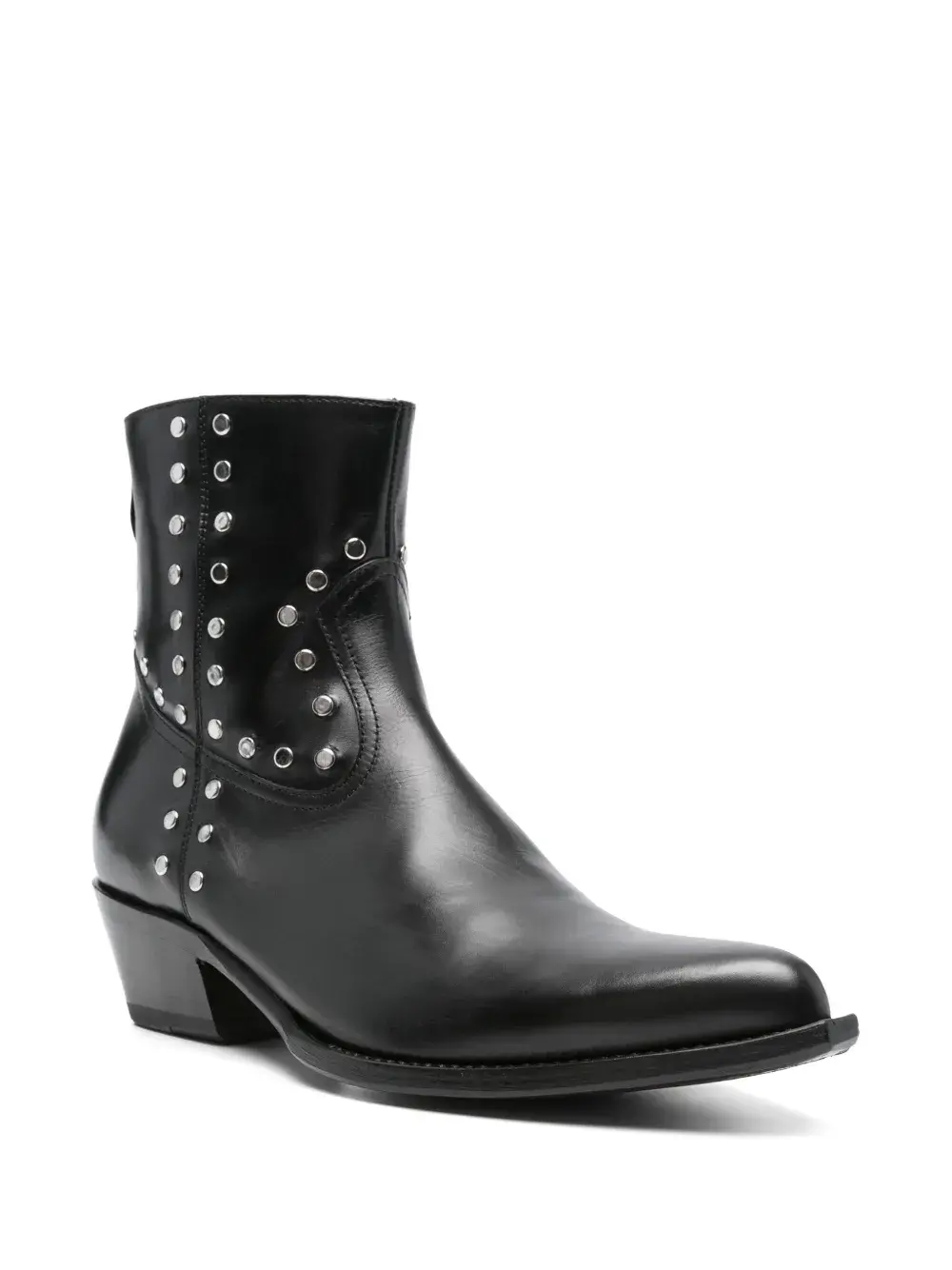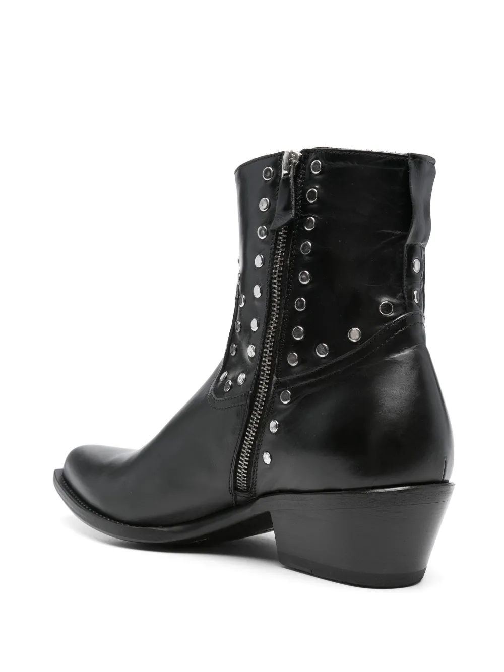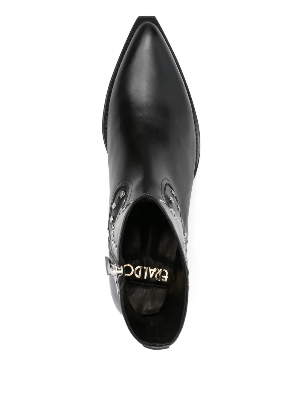 Черная застежка-молния сбоку, фирменная кожаная стелька, острый носок, отделка серебристыми заклепками