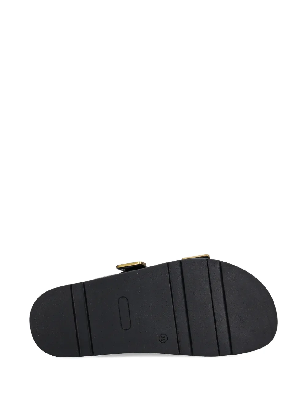 Верх из черной кожи, двойной ремешок, застежка на золотистой пряжке, плоская подошва, ребристая подошва