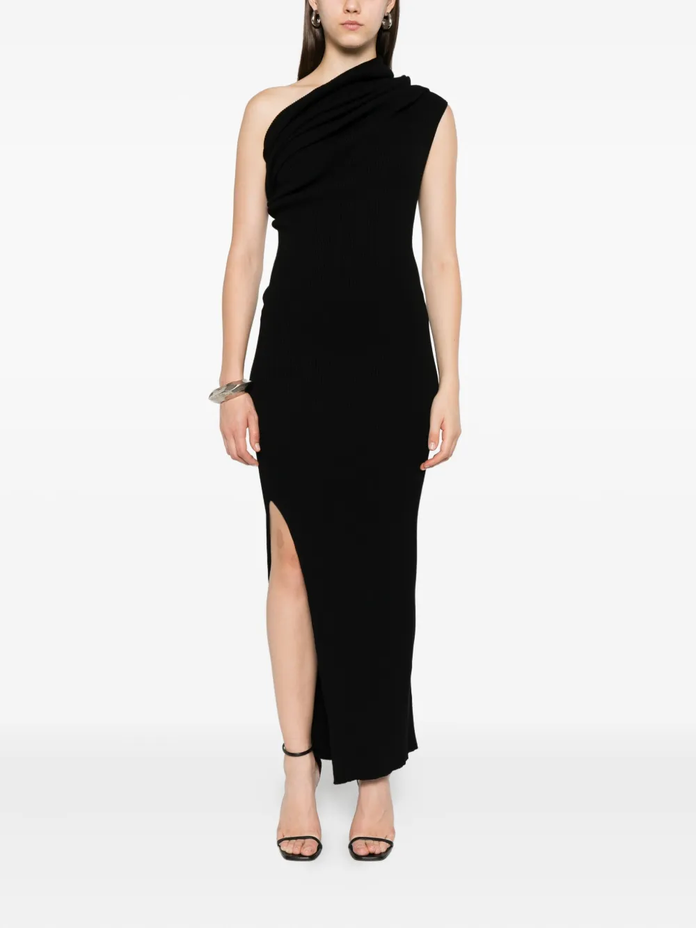 Черный, вырез на одно плечо, без рукавов, ребристая вязка, длина до щиколотки, прямой подол