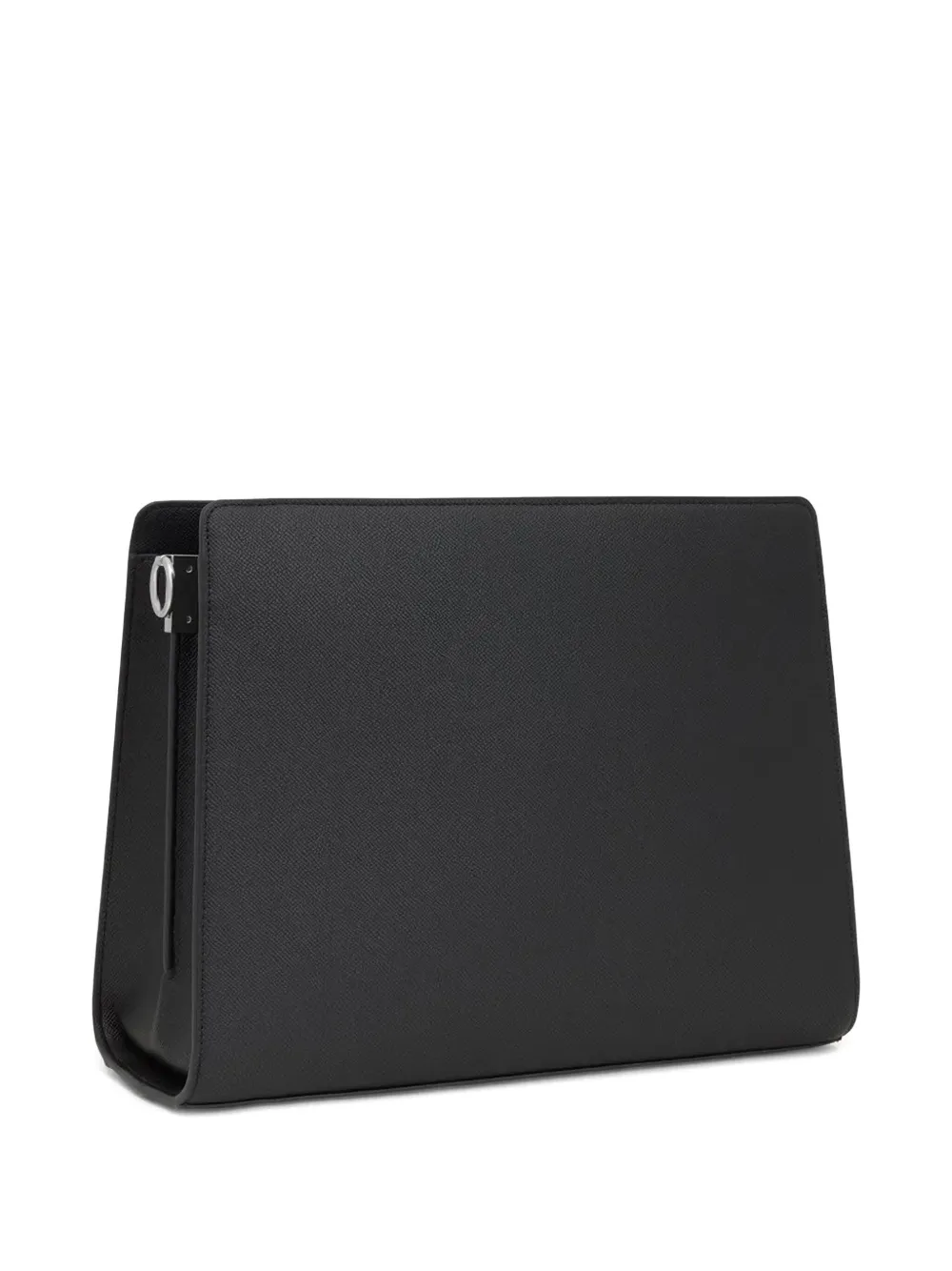 Черная текстурированная кожа, тисненый логотип, верхняя ручка, плетеный плечевой ремень, застежка на клапане