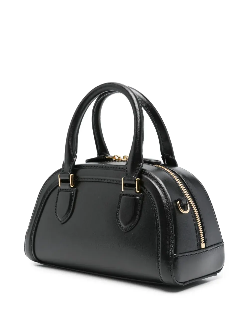 Черная телячья кожа, две закругленные ручки сверху, застежка-молния, золотистая фурнитура, изогнутый силуэт
