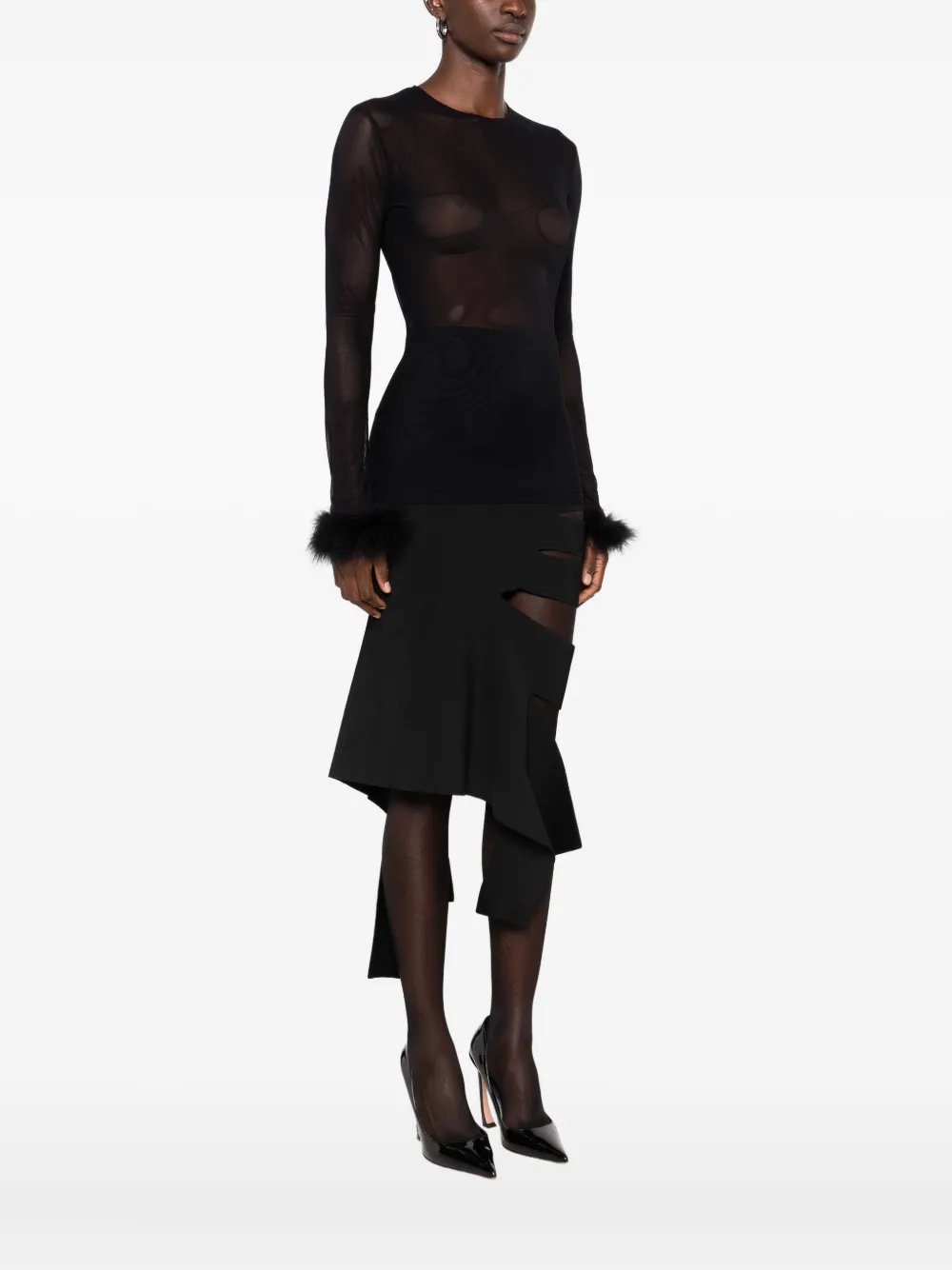 Черная сетчатая ткань, длинные рукава, круглый вырез, манжеты с перьями